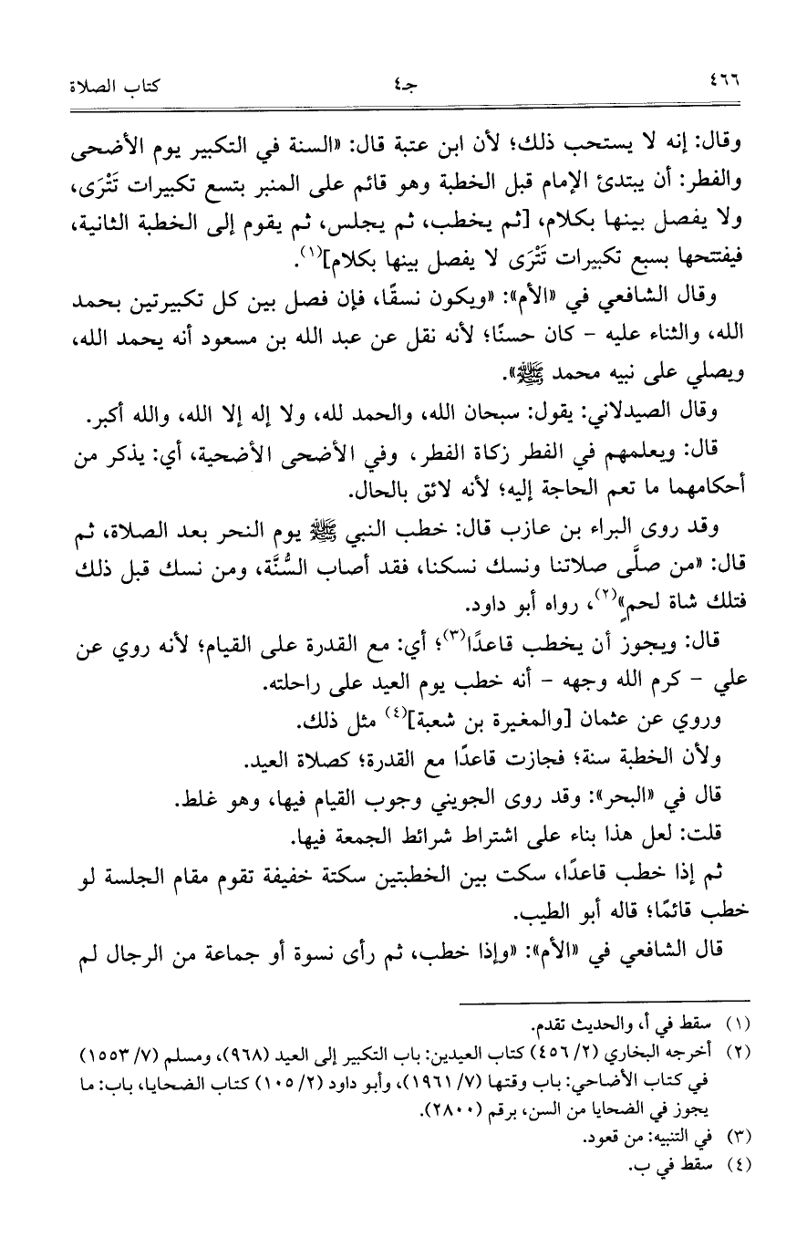 وقد روى البراء بن عازب قال: خطب النبي صلى الله عليه وسلم يوم النحر بعد الصلاة، ثم قال: "من صلَّى صلاتنا ونسك نسكنا، فقد أصاب السُّنَّة، ومن نسك قبل ذلك فتلك شاة لحمٍ"، رواه أبو داود.