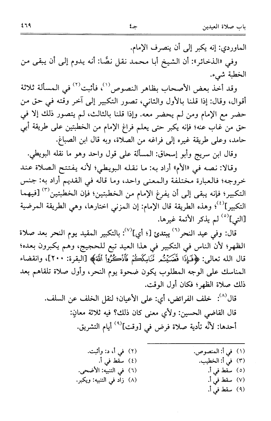 وقد أخذ بعض الأصحاب بظاهر النصوص، فأثبت في المسألة ثلاثة أقوال، وقال: إذا قلنا بالأول والثاني، تصور التكبير إلى آخر وقته في حق من حضر مع الإمام ومن لم يحضر معه. وإذا قلنا بالثالث، لم يتصور ذلك إلا في حق من غاب عنه؛ فإنه يكبر حتى يعلم فراغ الإمام من الخطبتين على طريقة أبي حامد، وعلى طريقة غيره إلى فراغه من الصلاة، وبه قال ابن الصباغ.