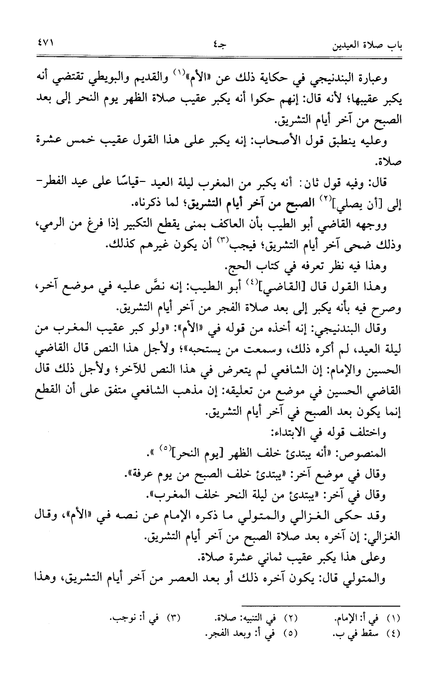 وعبارة البندنيجي في حكاية ذلك عن "الأم" والقديم والبويطي تقتضي أنه يكبر عقيبها؛ لأنه قال: إنهم حكوا أنه يكبر عقيب صلاة الظهر يوم النحر إلى بعد الصبح من آخر أيام التشريق.