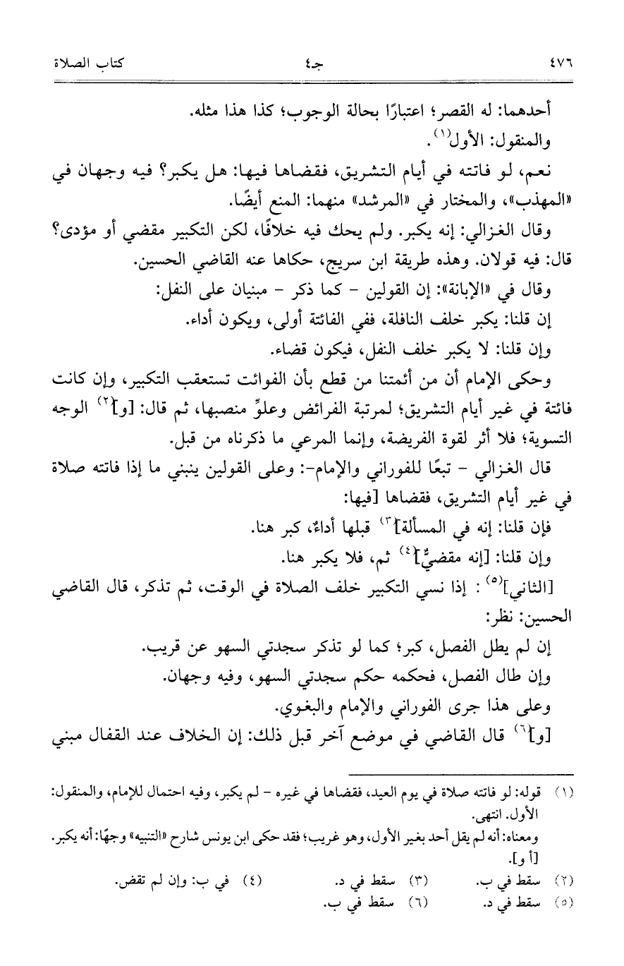 وحكى الإمام أن من أئمتنا من قطع بأن الفوائت تستعقب التكبير، وإن كانت فائتة في غير أيام التشريق؛ لمرتبة الفرائض وعلوِّ منصبها، ثم قال: [و] الوجه التسوية؛ فلا أثر لقوة الفريضة، وإنما المرعي ما ذكرناه من قبل.