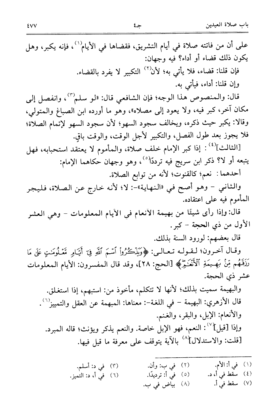 قال: وإذا رأى شيئاً من بهيمة الأنعام في الأيام المعلومات- وهي العشر الأول من ذي الحجة- كبر.