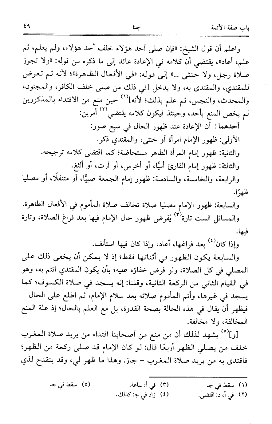 واعلم أن قول الشيخ: "فإن صلى أحد هؤلاء خلف أحد هؤلاء، ولم يعلم، ثم علم، أعاد"، يقتضي أن كلامه في الإعادة عائد إلى ما ذكره من قوله: "ولا تجوز صلاة رجل، ولا خنثى ... " إلى قوله: "في الأفعال الظاهرة؛ لأنه ثم تعرض للمقتدي، والمقتدى به، ولا يدخل [في ذلك من صلى خلف الكافر، والمجنون، والمحدث، والنجس، ثم علم بذلك؛ لأنه] حين منع من الاقتداء بالمذكورين لم يخص المنع بأحد، وحينئذ فيكون كلامه يقتضي أمرين: