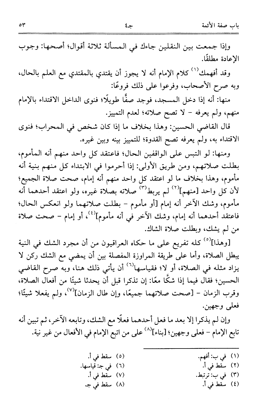 ومنها: لو التبس على الواقفين الحال؛ فاعتقد كل واحد منهم أنه المأموم، بطلت صلاتهم، ومن طريق الأولى: إذا أحرموا في الابتداء كل منهم بنية أنه مأموم، وهذا بخلاف ما لو اعتقد كل واحد منهم أنه إمام، صحت صلاة الجميع؛ لأن كل واحد [منهم] لم يربط صلاته بصلاة غيره، ولو اعتقد أحدهما أنه مأموم، وشك الآخر أنه إمام [أو مأموم - بطلت صلاتهما ولو انعكس الحال؛ فاعتقد أحدهما أنه إمام، وشك الآخر في أنه مأموم]، أو إمام - صحت صلاة من لم يثك، وبطلت صلاة الشاك.