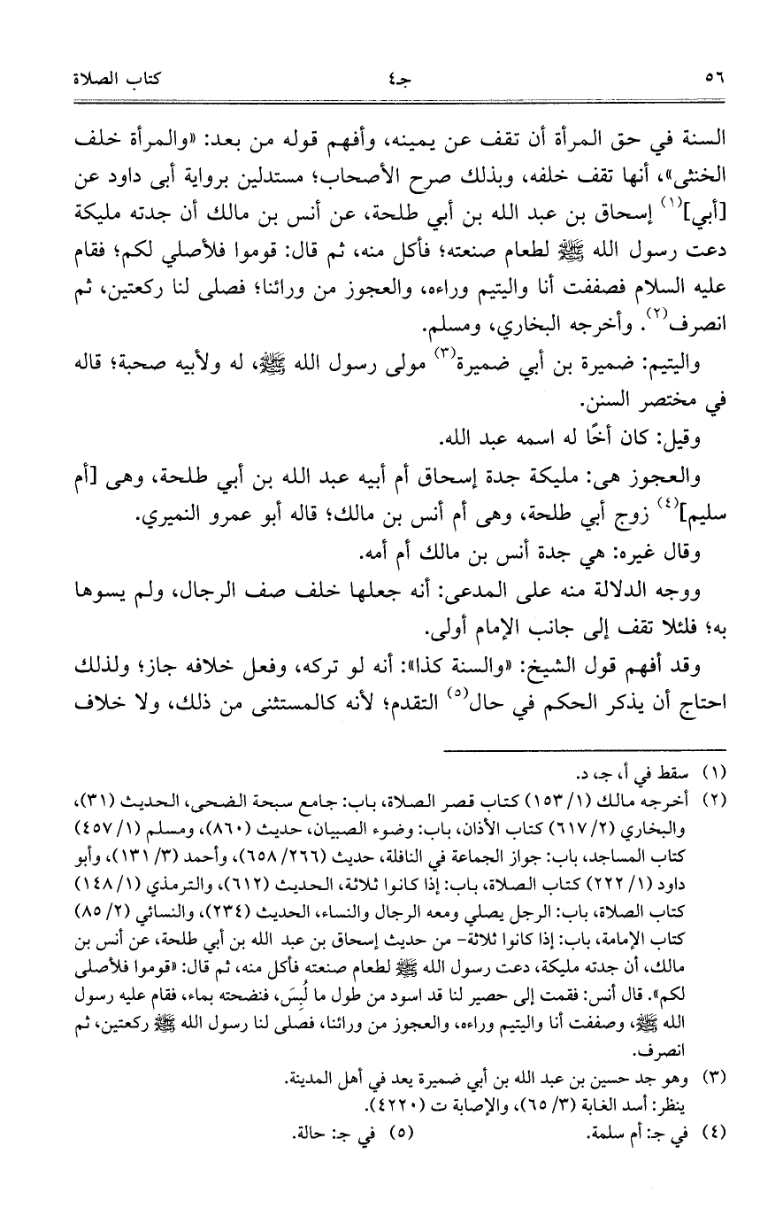 السنة في حق المرأة أن تقف عن يمينه، وأفهم قوله من بعد: "والمرأة خلف الخنثى"، أنها تقف خلفه، وبذلك صرح الأصحاب؛ مستدلين برواية أبى داود عن [أبي] إسحاق بن عبد الله بن أبي طلحة، عن أنس بن مالك أن جدته مليكة دعت رسول الله صلى الله عليه وسلم لطعام صنعته؛ فأكل منه، ثم قال: قوموا فلأصلي لكم؛ فقام عليه السلام فصففت أنا واليتيم وراءه، والعجوز من ورائنا؛ فصلى لنا ركعتين، ثم انصرف. وأخرجه البخاري، ومسلم.