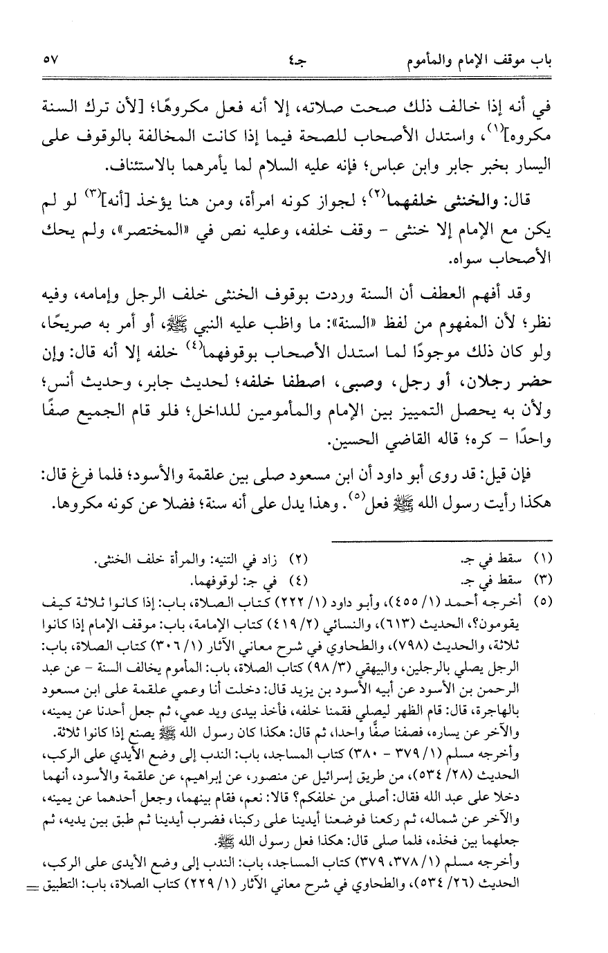 وقد أفهم العطف أن السنة وردت بوقوف الخنثى خلف الرجل وإمامه، وفيه نظر؛ لأن المفهوم من لفظ "السنة": ما واظب عليه النبي صلى الله عليه وسلم، أو أمر به صريحاً، ولو كان ذلك موجوداً لما استدل الأصحاب بوقوفهما خلفه إلا أنه قال: وإن حضر رجلان، أو رجل، وصبي، اصطفا خلفه؛ لحديث جابر، وحديث أنس؛ ولأن به يحصل التمييز بين الإمام والمأمومين للداخل؛ فلو قام الجميع صفاً واحداً- كره؛ قاله القاضي الحسين.