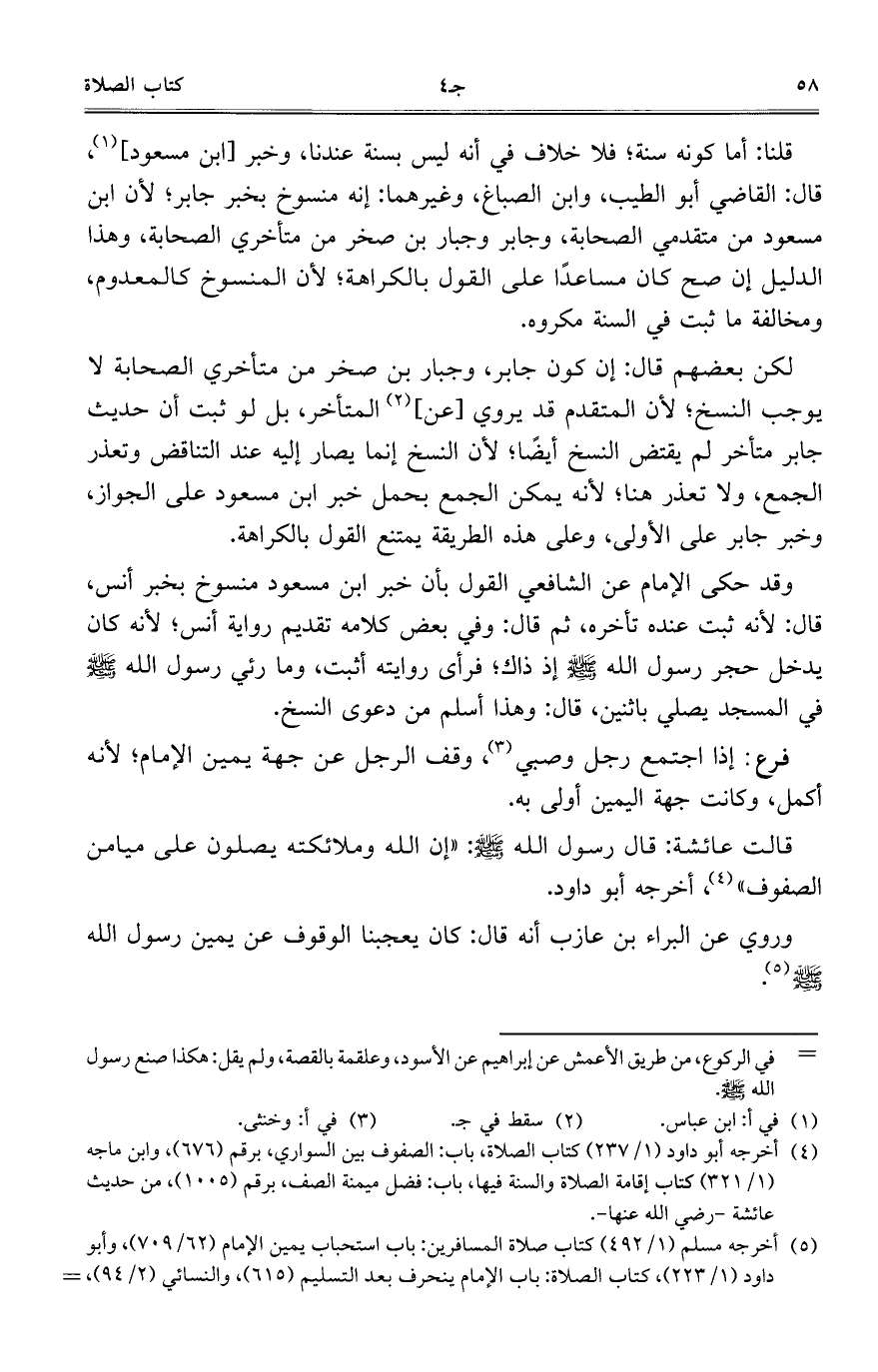 قلنا: أما كونه سنة؛ فلا خلاف في أنه ليس بسنة عندنا، وخبر [ابن مسعود]، قال: القاضي أبو الطيب، وابن الصباغ، وغيرهما: إنه منسوخ بخبر جابر؛ لأن ابن مسعود من متقدمى الصحابة، وجابر وجبار بن صخر من متأخري الصحابة، وهذا الدليل إن صح كان مساعداً على القول بالكراهة؛ لأن المنسوخ كالمعدوم، ومخالفة ما ثبت في السنة مكروه.