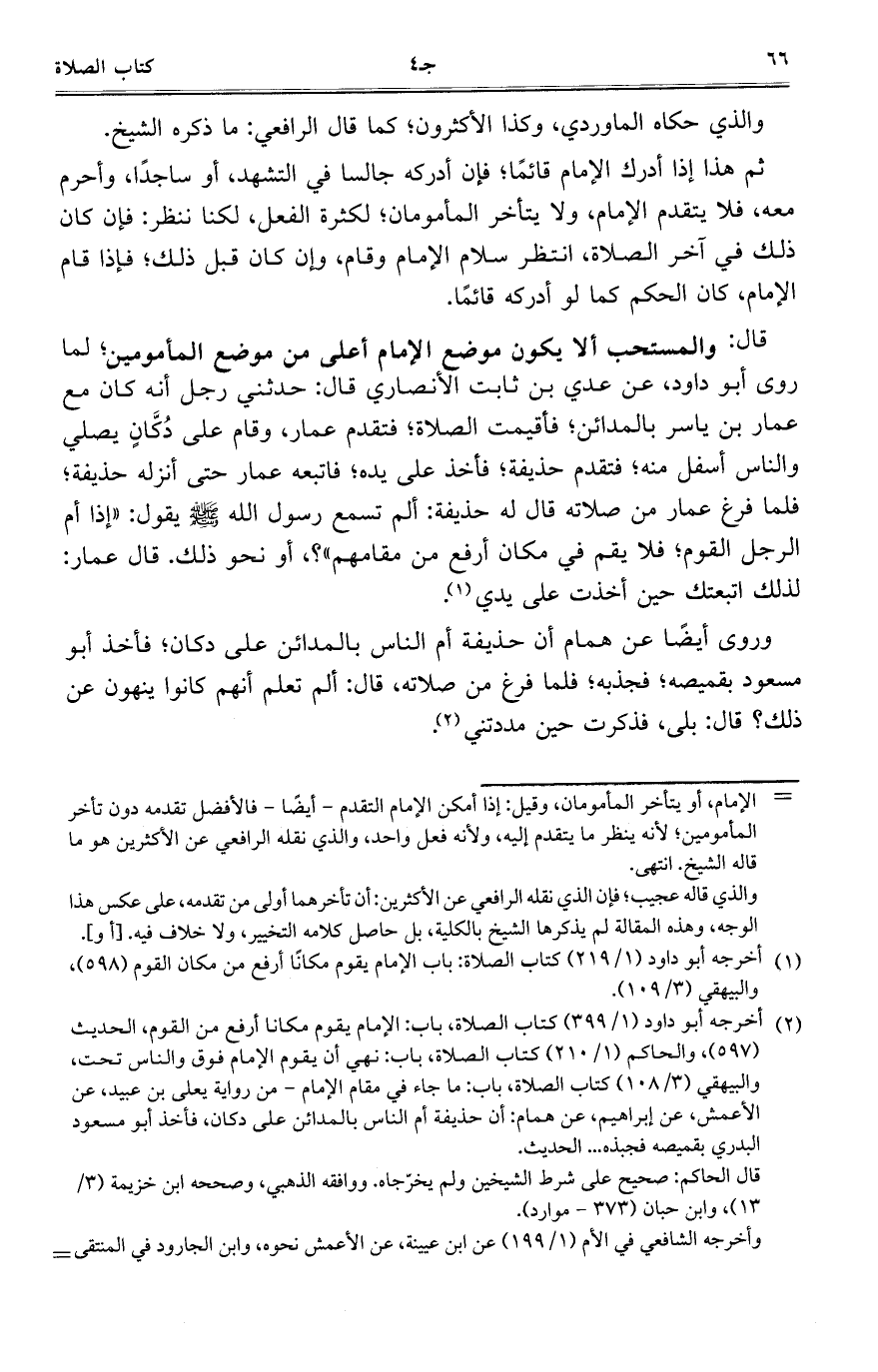 قال: والمستحب ألا يكون موضع الإمام أعلى من موضع المأمومين؛ لما روى أبو داود، عن عدي بن ثابت الأنصاري قال: حدثني رجل أنه كان مع عمار بن ياسر بالمدائن؛ فأقيمت الصلاة؛ فتقدم عمار، وقام على دُكَّانٍ يصلي والناس أسفل منه؛ فتقدم حذيفة؛ فأخذ على يده؛ فاتبعه عمار حتى أنزله حذيفة؛ فلما فرغ عمار من صلاته قال له حذيفة: ألم تسمع رسول الله صلى الله عليه وسلم يقول: "إذا أم الرجل القوم؛ فلا يقم في مكان أرفع من مقامهم"؟، أو نحو ذلك. قال عمار: لذلك اتبعتك حين أخذت على يدي.