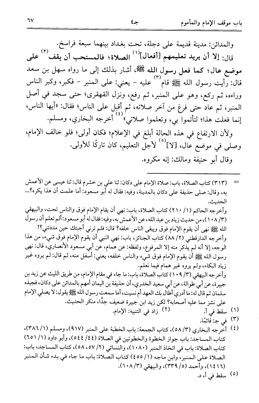 قال: إلا أن يريد تعليمهم [أفعال] الصلاة؛ فالمستحب أن يقف على موضع عال؛ كما فعل رسول الله صلى الله عليه وسلم، أشار بذلك إلى ما رواه سهل بن سعد قال: رأيت رسول الله صلى الله عليه وسلم قام عليه – يعني: على المنبر - فكبر، وكبر الناس وراءه، ثم ركع، وهو على المنبر، ثم رفع، ونزل القهقرى؛ حتى سجد في أصل المنبر، ثم عاد حتى فرغ من آخر صلاته، ثم أقبل على الناس؛ فقال: "أيها الناس، إنما فعلت هذا؛ لتأتموا يي، وتعلموا صلاتي" أخرجه البخاري، ومسلم.