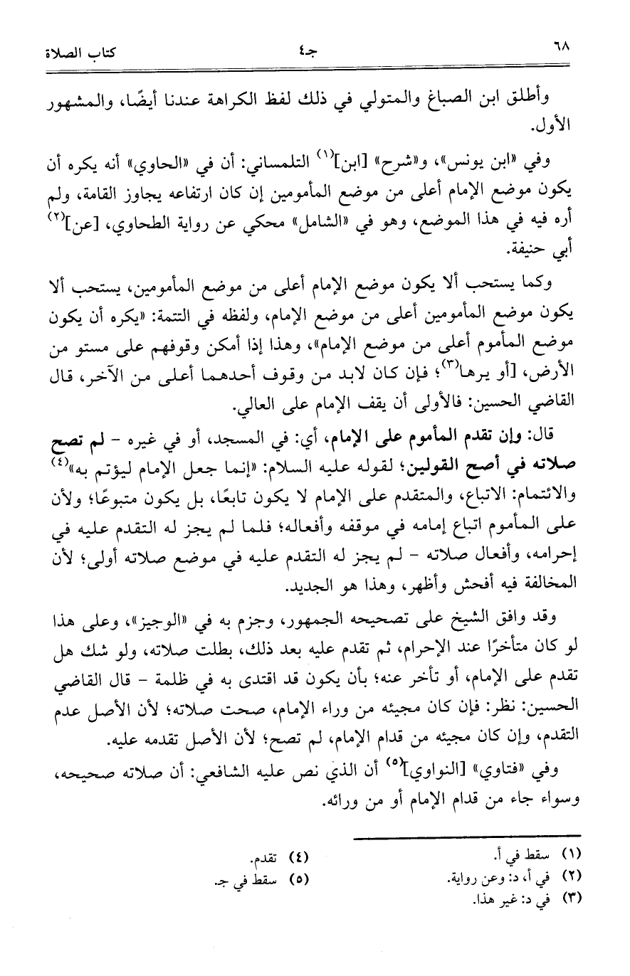 قال: وإن تقدم المأموم على الإمام، أي: في المسجد، أو في غيره - لم تصح صلاته في أصح القولين؛ لقوله عليه السلام: "إنما جعل الإمام ليؤتم به" والائتمام: الاتباع، والمقدم على الإمام لا يكون تابعاً، بل يكون متبوعاً؛ ولأن على المأموم اتباع إمامه في موقفه وأفعاله؛ فلما لم يجز له التقدم عليه في إحرامه، وأفعال صلاته - لم يجز له التقدم عليه في موضع صلاته أولى؛ لأن المخالفة فيه أفحش وأظهر، وهذا هو الجديد.