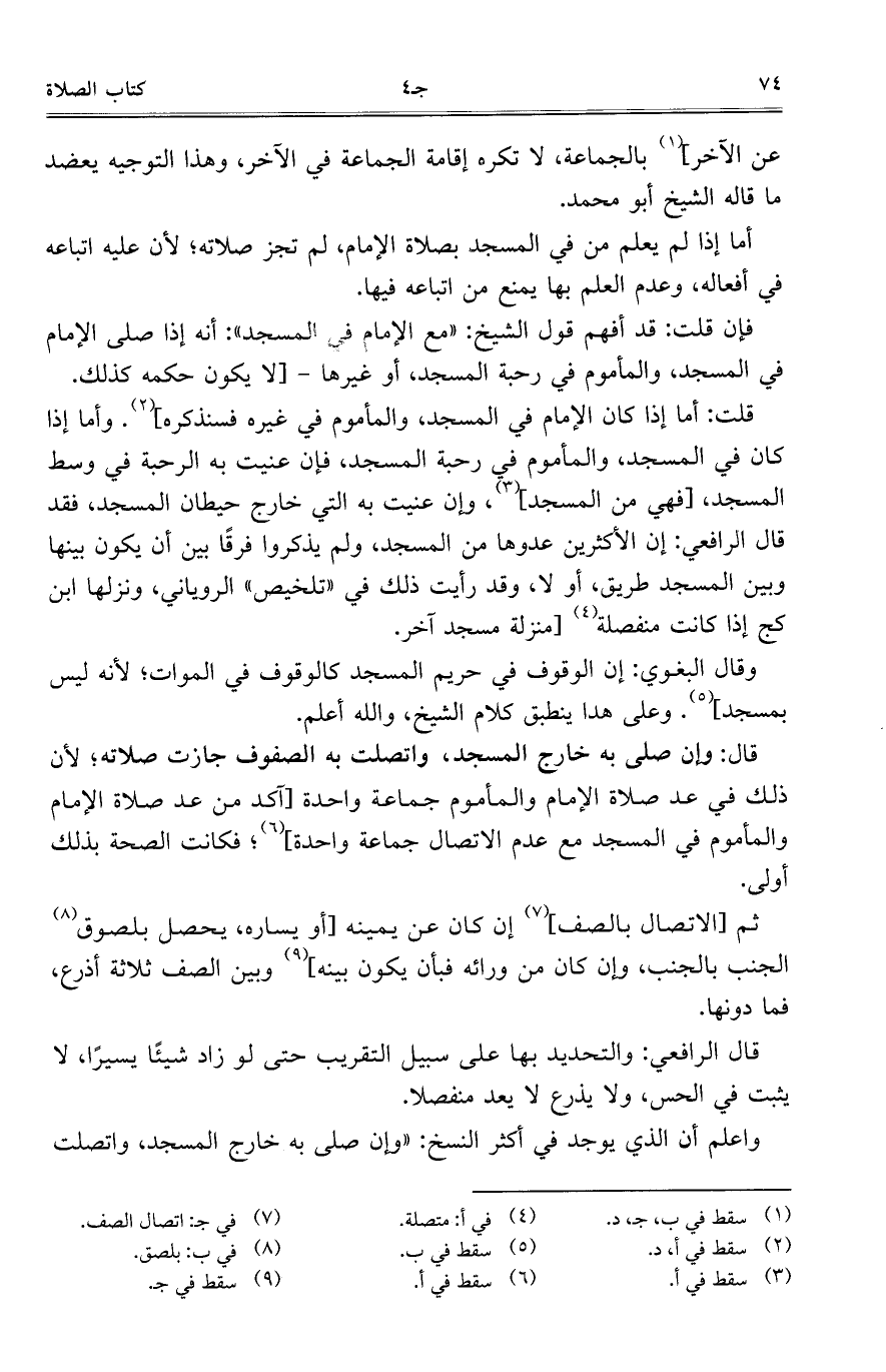 قلت: أما إذا كان الإمام في المسجد، والمأموم في غيره فسنذكره]. وأما إذا كان في المسجد، والمأموم في رحبة المسجد، فإن عنيت به الرحبة في وسط المسجد، [فهي من المجد]، وإن عنيت به التي خارج حيطان المسجد، فقد قال الرافعي: إن الأكثرين عدوها من المسجد، ولم يذكروا فرقاً بين أن يكون بينها وبين المسجد طريق، أو لا، وقد رأيت ذلك فى "تلخيص" الرويانى، ونزلها ابن كج إذا كانت منفصلة [منزلة مسجد آخر.