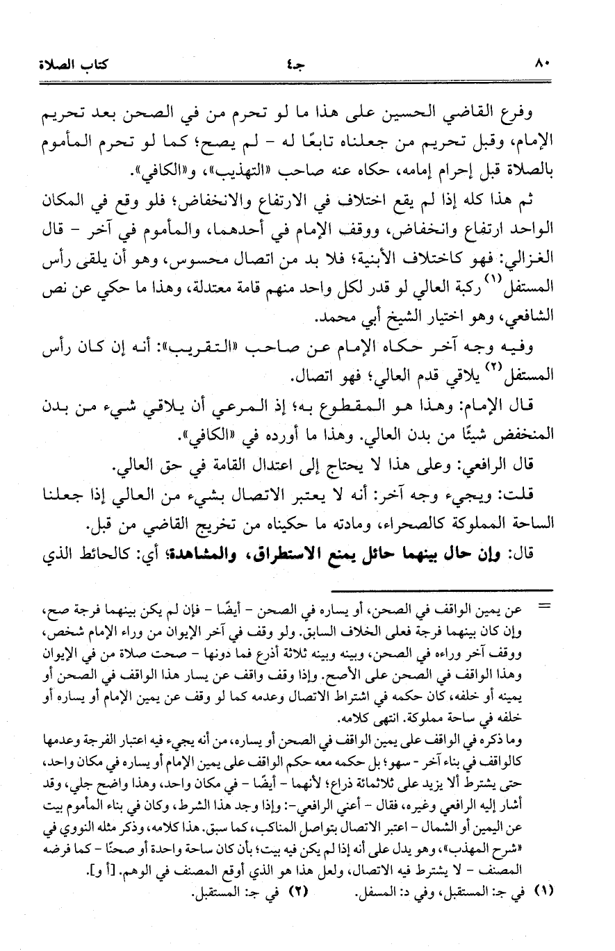 ثم هذا كله إذا لم يقع اختلاف في الارتفاع والانخفاض؛ فلو وقع في المكان الواحد ارتفاع وانخفاض، ووقف الإمام في أحدهما، والمأموم في آخر - قال الغزالي: فهو كاختلاف الأبنية؛ فلا بد من اتصال محسوس، وهو أن يلقي رأس المستفل ركبة العالي لو قدر لكل واحد منهم قامة معتدلة، وهذا ما حكي عن نص الشافعي، وهو اختيار الشيخ أي محمد.