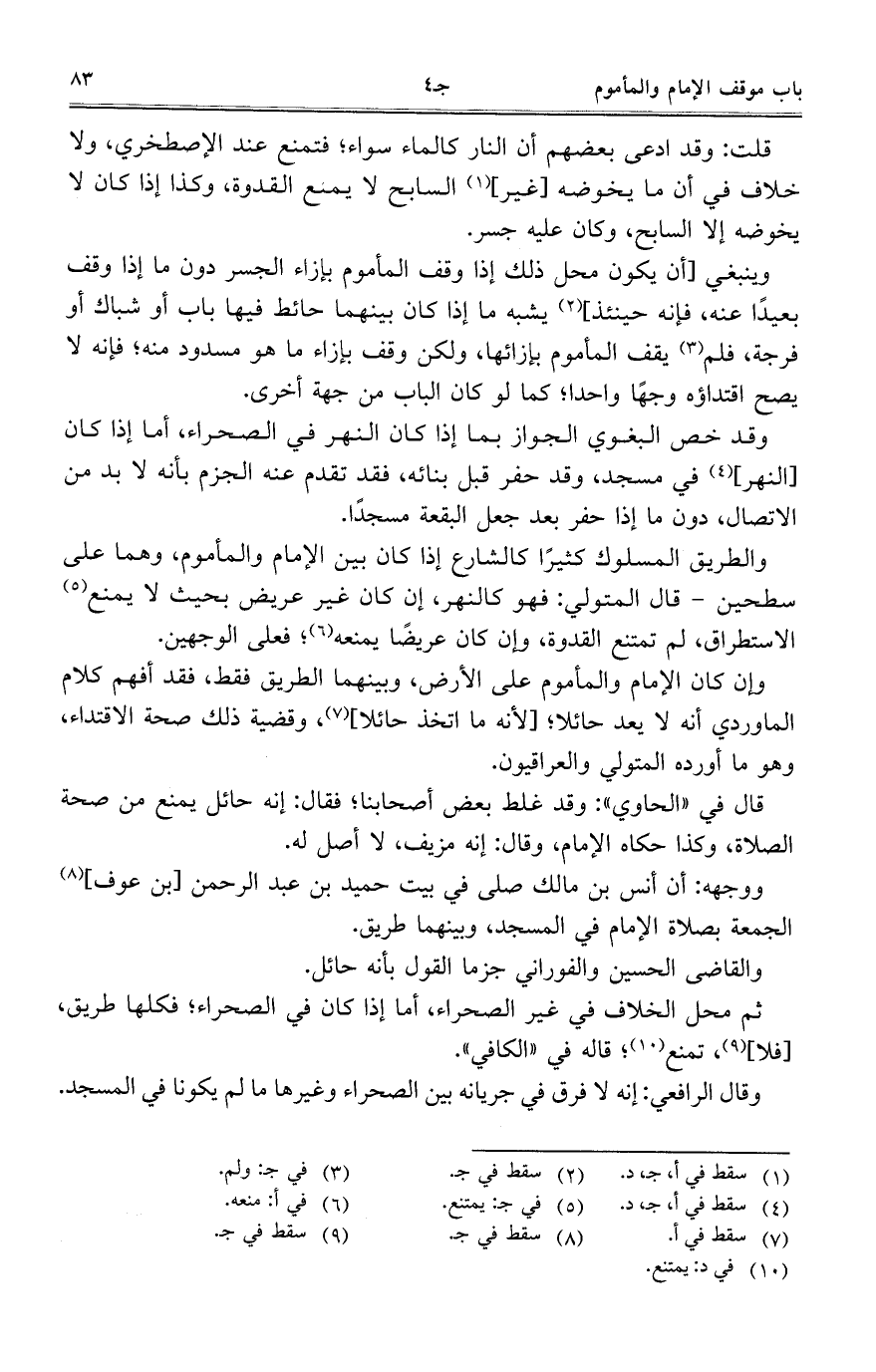 وينبغي [أن يكون محل ذلك إذا وقف المأموم بإزاء الجسر دون ما إذا وقفا بعيداً عنه، فإنه حينئذ] يشبه ما إذا كان بينهما حائط فيها باب أو شباك أو فرجة، فلم يقف المأموم بإزائها، ولكن وقف يإزاء ما هو مسدود منه؛ فإنه لا يصح اقتداؤه وجهاً واحداً؛ كما لو كان الباب من جهة أخرى.