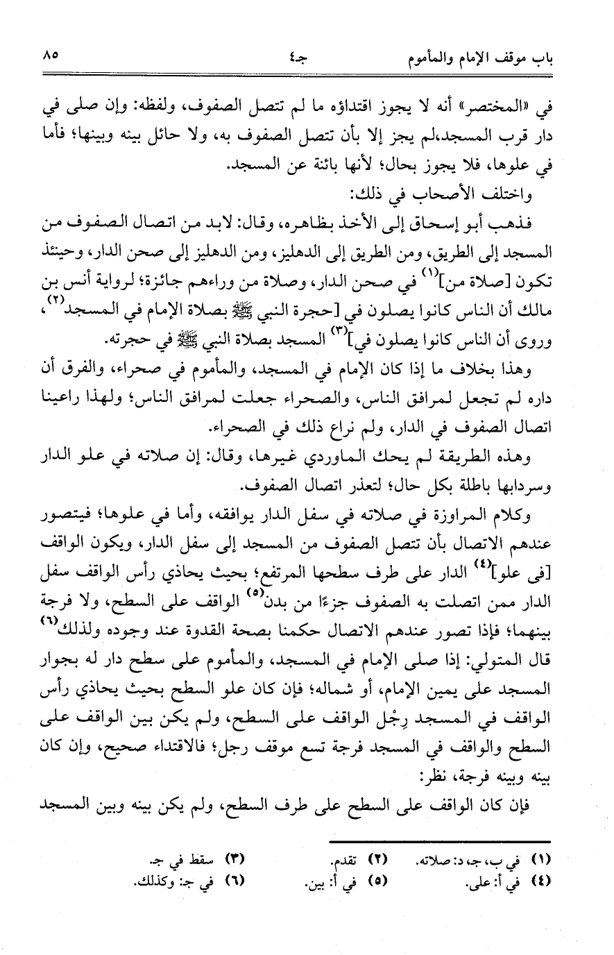 وكلام المراوزة في صلاته في سفل الدار يوافقه، وأما في علوها؛ فيتصور عندهم الاتصال بأن تتصل الصفوف من المسجد إلى سفل الدار، ويكون الواقف [فى علوء الدار على طرف سطحها المرتفع؛ بحيث يحاذي رأس الواقف سفل الدار ممن اتصلت به الصنوف جزءاً من بدن الواقف على السطح، ولا فرجة بينهما؛ فإذا تصور عندهم الاتصال حكمنا بصحة القدوة عند وجوده ولذلك قال المتولي: إذا صلى الإمام في المسجد، والمأموم على سطح دار له بجوار المسجد على يمين الإمام، أو شماله؛ فإن كان علو السطح بحيث يحاذي رأس الواقف في المسجد رِجْل الواقف على السطح، ولم يكن بين الواقف على السطح والواقف في المسجد فرجة تسع موقف رجل؛ فالاقتداء صحيح، وإن كان بينه وبينه فرجة، نظر: