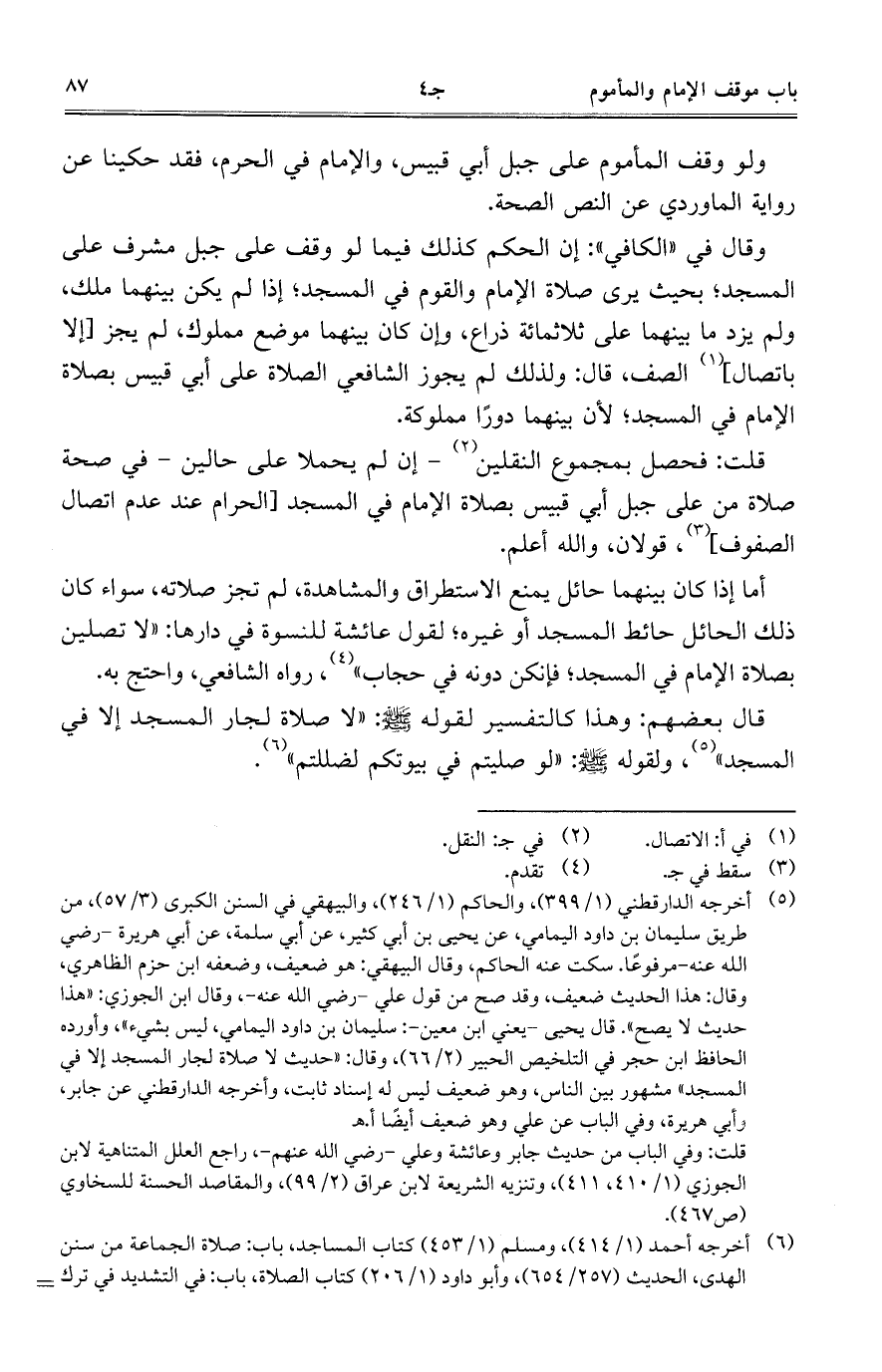 قلت: فحصل بمجموع النقلين - إن لم يحملا على حالين - في صحة صلاة من على جبل أبي قبيس بصلاة الإمام في المجد [الحرام عند عدم اتصال الصفوف]، قولان، والله أعلم.