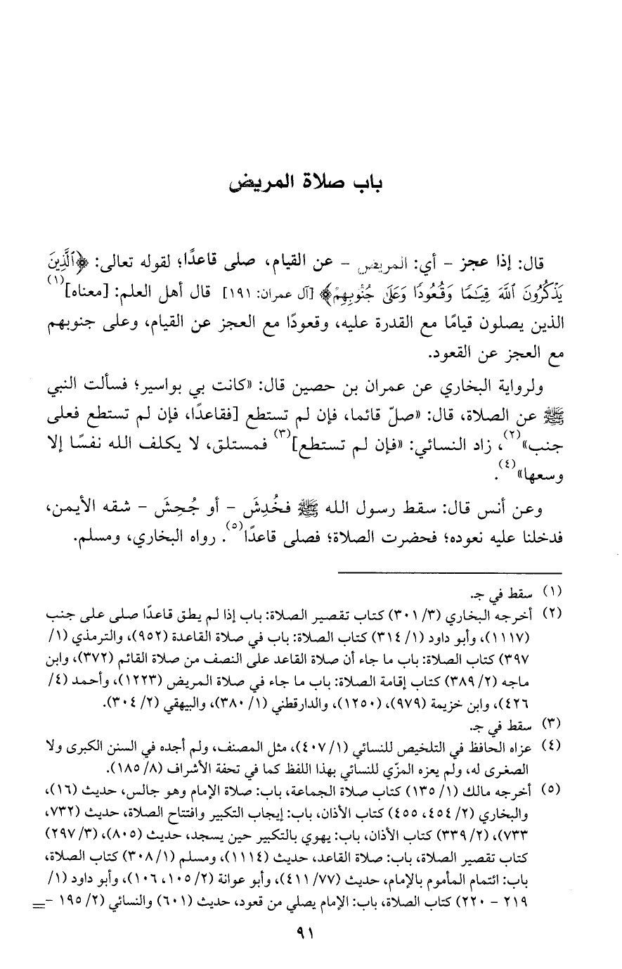 ولرواية البخاري عن عمران بن حصين قال: "كانت بي بواسير؛ فسألت النبي صلى الله عليه وسلم عن الصلاة، قال: "صلّ قائماً، فإن لم تستطع [فقاعداً، فإن لم تستطع فعلى جنب"، زاد النسائي: "فإن لم تستطع] فمستلق، لا يكلف الله نفساً إلا وسعها".