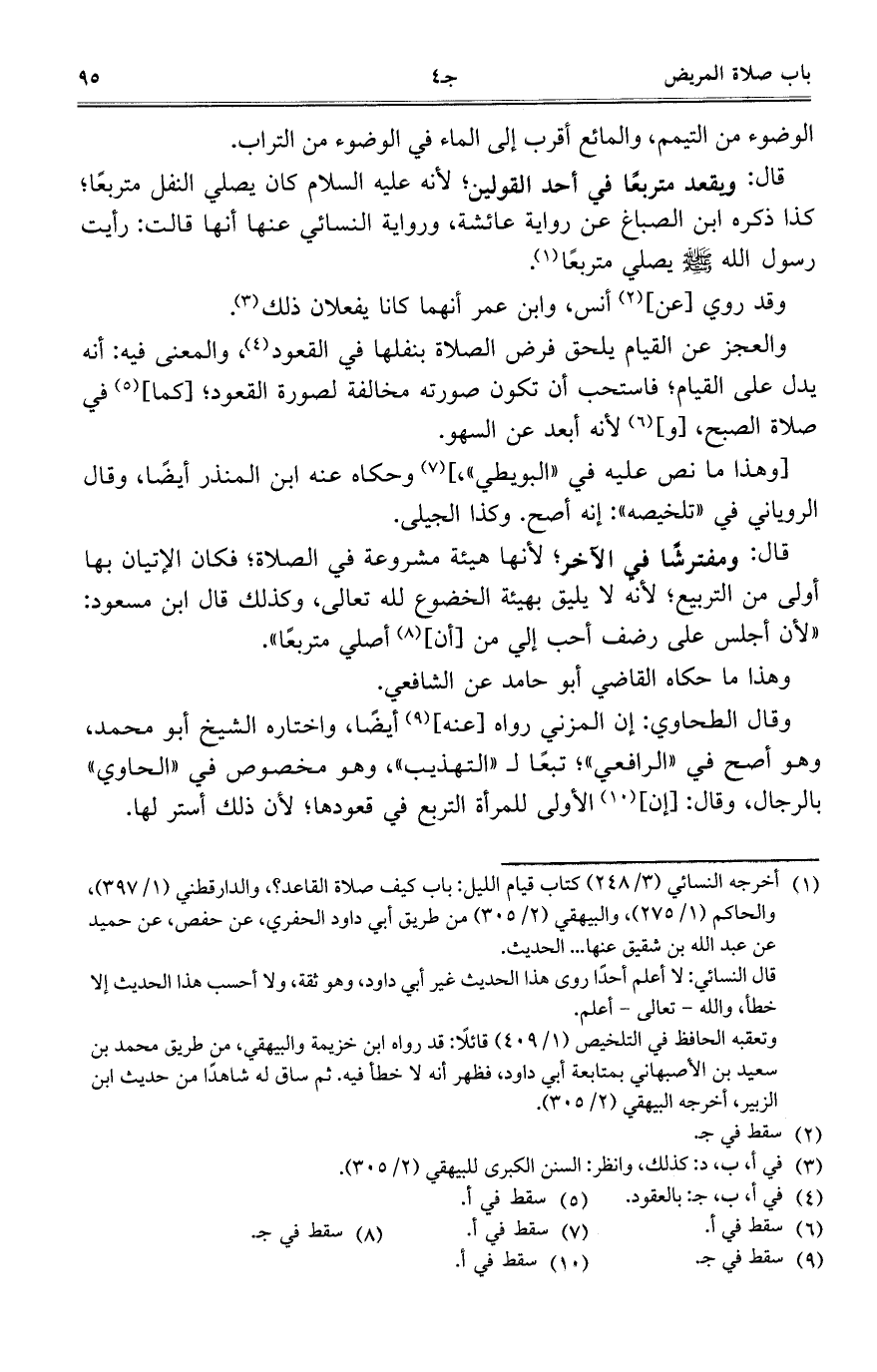 قال: ويقعد متربعاً في أحد القولين؛ لأنه عليه السلام كان يصلي النفل متربعاً؛ كذا ذكره ابن الصباغ عن رواية عائشة، ورواية النسائي عنها أنها قالت: رأيت رسول الله صلى الله عليه وسلم بصلي متربعا.