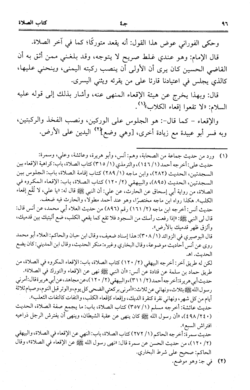قال: وبهذا يخرج عن هيئة الإقعاء المنهي عنه، وأشار بذلك إلى قوله عليه السلام: "لا تقعوا إقعاء الكلاب".