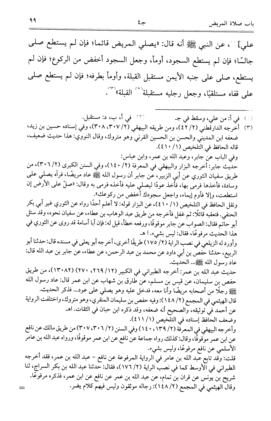 علي]، عن النبي صلى الله عليه وسلم أنه قال: "يصلي المريض قائماً؛ فإن لم يستطع صلى جالساً؛ فإن لم يستطع السجود، أومأ، وجعل السجود أخفض من الركوع؛ فإن لم يستطع، صلى على جنبه الأيمن مستقبل القبلة، وأومأ بطرفه؛ فإن لم يستطع صلى على قفاه مستلقياً، وجعل رجليه مستقبلة القبلة".
