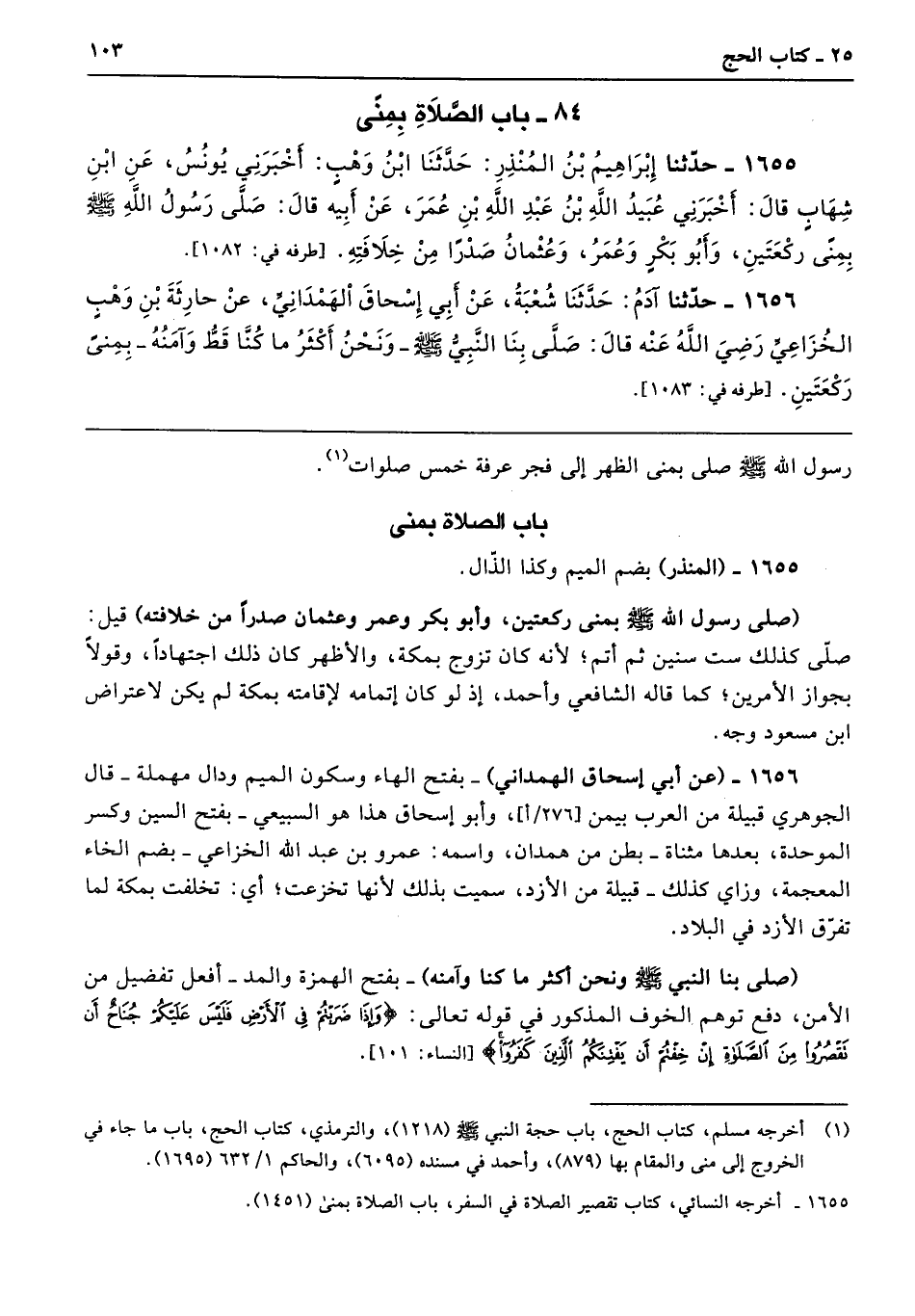 1656 - حَدَّثَنَا آدَمُ حَدَّثَنَا شُعْبَةُ عَنْ أَبِى إِسْحَاقَ الْهَمْدَانِىِّ عَنْ حَارِثَةَ بْنِ وَهْبٍ الْخُزَاعِىِّ - رضى الله عنه - قَالَ صَلَّى بِنَا النَّبِىُّ - صلى الله عليه وسلم - وَنَحْنُ أَكْثَرُ مَا كُنَّا قَطُّ وَآمَنُهُ بِمِنًى رَكْعَتَيْنِ. طرفه 1083