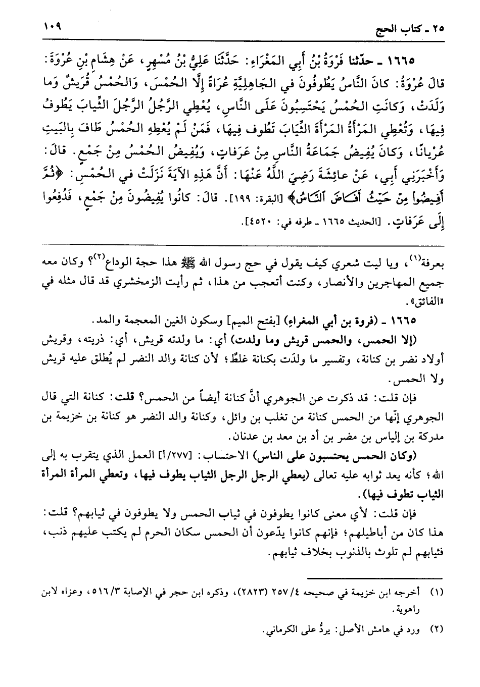 1665 - حَدَّثَنَا فَرْوَةُ بْنُ أَبِى الْمَغْرَاءِ حَدَّثَنَا عَلِىُّ بْنُ مُسْهِرٍ عَنْ هِشَامِ بْنِ عُرْوَةَ قَالَ عُرْوَةُ كَانَ النَّاسُ يَطُوفُونَ فِي الْجَاهِلِيَّةِ عُرَاةً إِلاَّ الْحُمْسَ، وَالْحُمْسُ قُرَيْشٌ وَمَا وَلَدَتْ، وَكَانَتِ الْحُمْسُ يَحْتَسِبُونَ عَلَى النَّاسِ يُعْطِى الرَّجُلُ الرَّجُلَ الثِّيَابَ يَطُوفُ فِيهَا، وَتُعْطِى الْمَرْأَةُ الْمَرْأَةَ الثِّيَابَ تَطُوفُ فِيهَا، فَمَنْ لَمْ يُعْطِهِ الْحُمْسُ طَافَ بِالْبَيْتِ عُرْيَانًا، وَكَانَ يُفِيضُ جَمَاعَةُ النَّاسِ مِنْ عَرَفَاتٍ، وَيُفِيضُ الْحُمْسُ مِنْ جَمْعٍ. قَالَ وَأَخْبَرَنِى أَبِى عَنْ عَائِشَةَ - رضى الله عنها - أَنَّ هَذِهِ الآيَةَ نَزَلَتْ فِي الْحُمْسِ (ثُمَّ أَفِيضُوا مِنْ حَيْثُ أَفَاضَ النَّاسُ) قَالَ كَانُوا يُفِيضُونَ مِنْ جَمْعٍ فَدُفِعُوا إِلَى عَرَفَاتٍ. طرفه 4520
