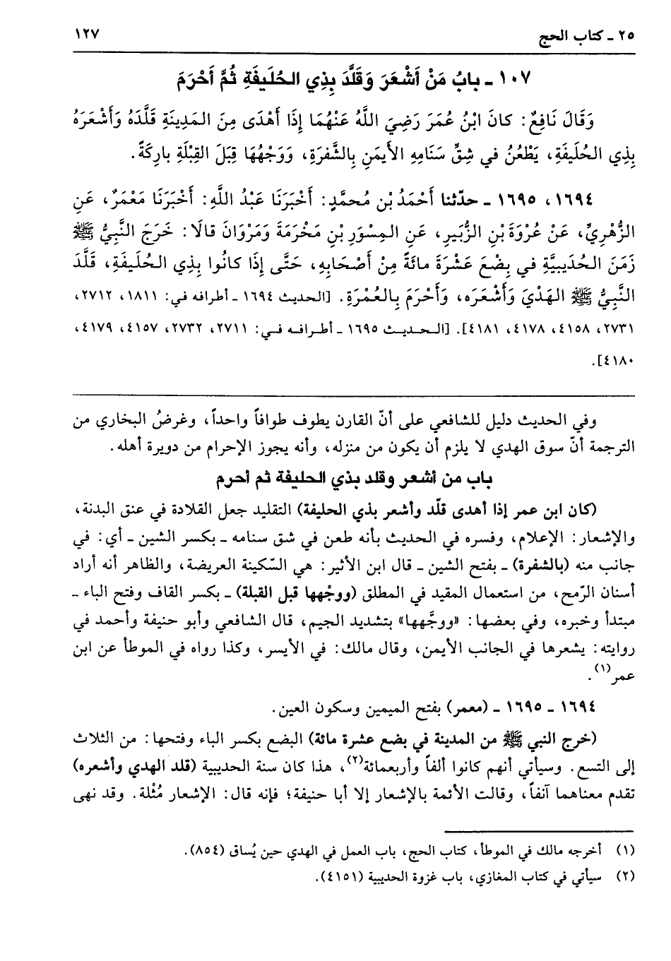 1694 و 1695 - حَدَّثَنَا أَحْمَدُ بْنُ مُحَمَّدٍ أَخْبَرَنَا عَبْدُ اللَّهِ أَخْبَرَنَا مَعْمَرٌ عَنِ الزُّهْرِىِّ عَنْ عُرْوَةَ بْنِ الزُّبَيْرِ عَنِ الْمِسْوَرِ بْنِ مَخْرَمَةَ وَمَرْوَانَ قَالاَ خَرَجَ النَّبِىُّ - صلى الله عليه وسلم - مِنَ الْمَدِينَةِ زَمَنَ الْحُدَيْبِيَةِ فِي بِضْعَ عَشْرَةَ مِائَةً مِنْ أَصْحَابِهِ، حَتَّى إِذَا كَانُوا بِذِى الْحُلَيْفَةِ قَلَّدَ النَّبِىُّ - صلى الله عليه وسلم - الْهَدْىَ وَأَشْعَرَ وَأَحْرَمَ بِالْعُمْرَةِ. حديث 1694 أطرافه 1811، 2712، 2731، 4158، 4178، 4181، حديث 1695 أطرافه 2711، 2732، 4157، 4179، 4180