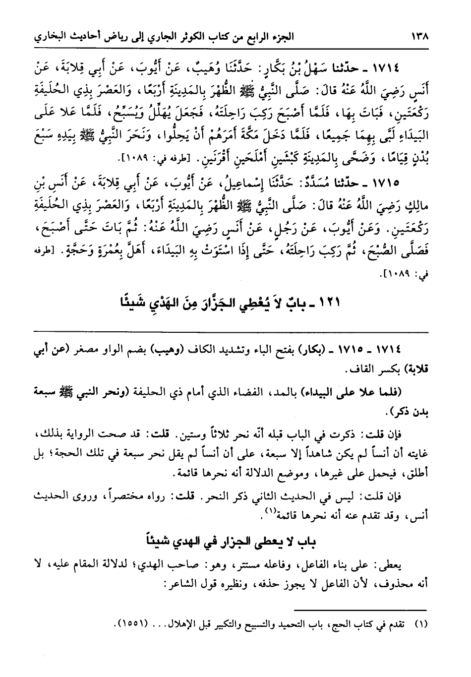 1714 - حَدَّثَنَا سَهْلُ بْنُ بَكَّارٍ حَدَّثَنَا وُهَيْبٌ عَنْ أَيُّوبَ عَنْ أَبِى قِلاَبَةَ عَنْ أَنَسٍ - رضى الله عنه - قَالَ صَلَّى النَّبِىُّ - صلى الله عليه وسلم - الظُّهْرَ بِالْمَدِينَةِ أَرْبَعًا، وَالْعَصْرَ بِذِى الْحُلَيْفَةِ رَكْعَتَيْنِ، فَبَاتَ بِهَا، فَلَمَّا أَصْبَحَ رَكِبَ رَاحِلَتَهُ، فَجَعَلَ يُهَلِّلُ وَيُسَبِّحُ، فَلَمَّا عَلاَ عَلَى الْبَيْدَاءِ لَبَّى بِهِمَا جَمِيعًا، فَلَمَّا دَخَلَ مَكَّةَ أَمَرَهُمْ أَنْ يَحِلُّوا. وَنَحَرَ النَّبِىُّ - صلى الله عليه وسلم - بِيَدِهِ سَبْعَ بُدْنٍ قِيَامًا، وَضَحَّى بِالْمَدِينَةِ كَبْشَيْنِ أَمْلَحَيْنِ أَقْرَنَيْنِ. طرفه 1089