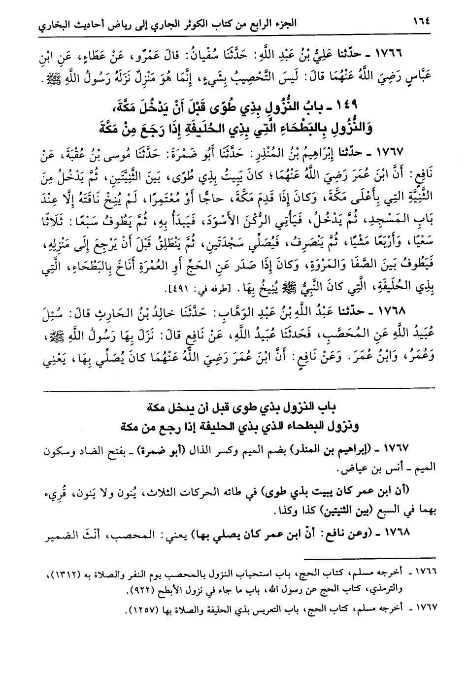 (أن ابن عمر كان يبيت بذي طوى) في طائه الحركات الثلاث، يُنون ولا يَنون، قُرِيء بهما في السبع (بين الثنيتين) كذا وكذا.
