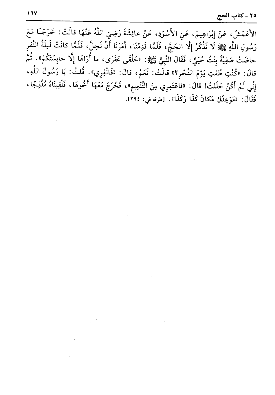 الأَعْمَشُ عَنْ إِبْرَاهِيمَ عَنِ الأَسْوَدِ عَنْ عَائِشَةَ - رضى الله عنها - قَالَتْ خَرَجْنَا مَعَ رَسُولِ اللَّهِ - صلى الله عليه وسلم - لاَ نَذْكُرُ إِلاَّ الْحَجَّ، فَلَمَّا قَدِمْنَا أَمَرَنَا أَنْ نَحِلَّ، فَلَمَّا كَانَتْ لَيْلَةُ النَّفْرِ حَاضَتْ صَفِيَّةُ بِنْتُ حُيَىٍّ، فَقَالَ النَّبِىُّ - صلى الله عليه وسلم - «حَلْقَى عَقْرَى، مَا أُرَاهَا إِلاَّ حَابِسَتَكُمْ». ثُمَّ قَالَ «كُنْتِ طُفْتِ يَوْمَ النَّحْرِ». قَالَتْ نَعَمْ. قَالَ «فَانْفِرِى». قُلْتُ يَا رَسُولَ اللَّهِ. إِنِّى لَمْ أَكُنْ حَلَلْتُ. قَالَ «فَاعْتَمِرِى مِنَ التَّنْعِيمِ». فَخَرَجَ مَعَهَا أَخُوهَا، فَلَقِينَاهُ مُدَّلِجًا. فَقَالَ «مَوْعِدُكِ مَكَانَ كَذَا وَكَذَا». طرفه 294