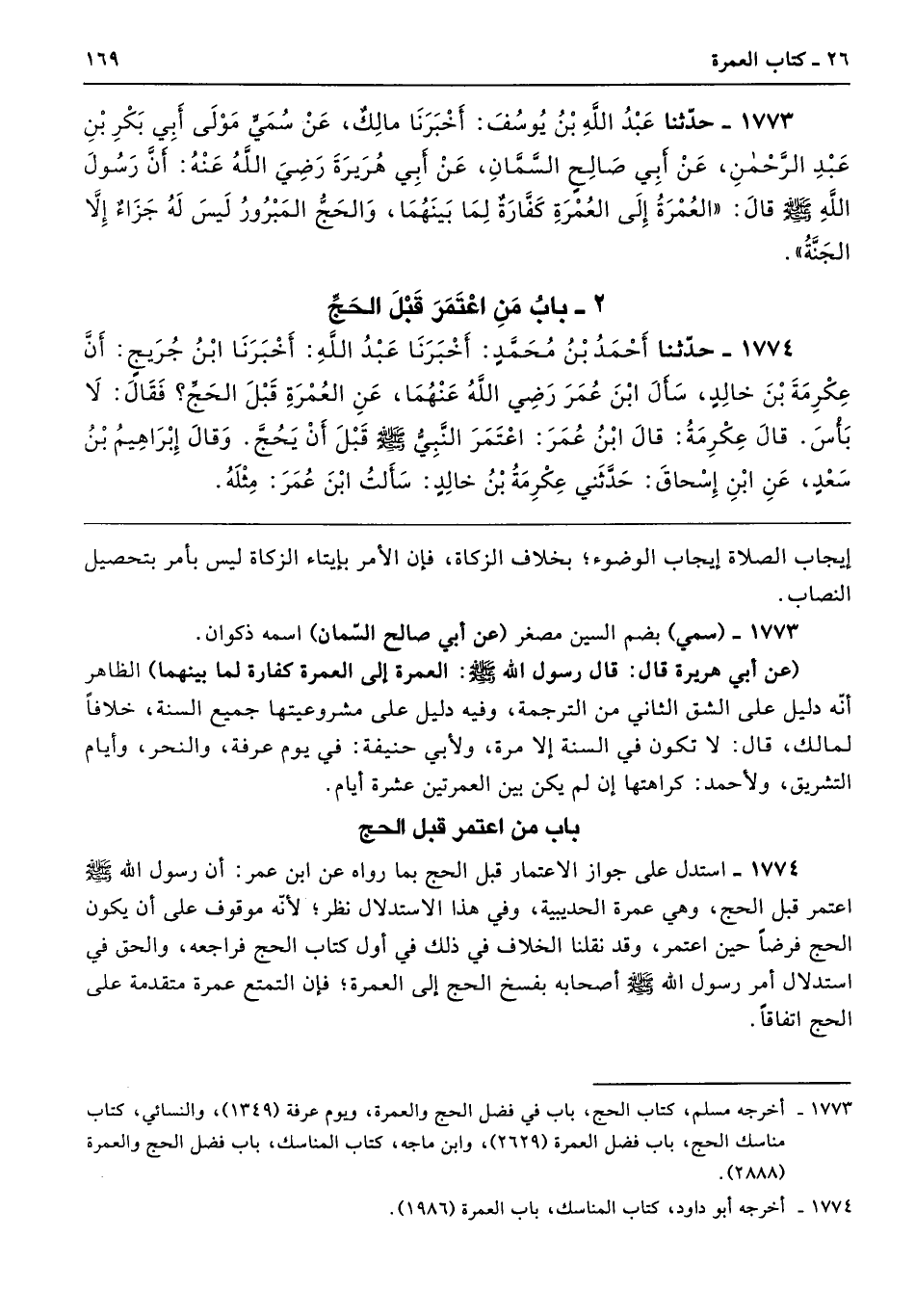 1774 - استدل على جواز الاعتمار قبل الحج بما رواه عن ابن عمر: أن رسول الله - صلى الله عليه وسلم - اعتمر قبل الحج، وهي عمرة الحديبية، وفي هذا الاستدلال نظر؛ لأنه موقوف على أن يكون الحج فرضًا حين اعتمر، وقد نقلنا الخلاف في ذلك في أول كتاب الحج فراجعه، والحق في استدلال أمر رسول الله - صلى الله عليه وسلم - أصحابه بفسخ الحج إلى العمرة؛ فإن التمتع عمرة متقدمة على الحج اتفاقًا.
