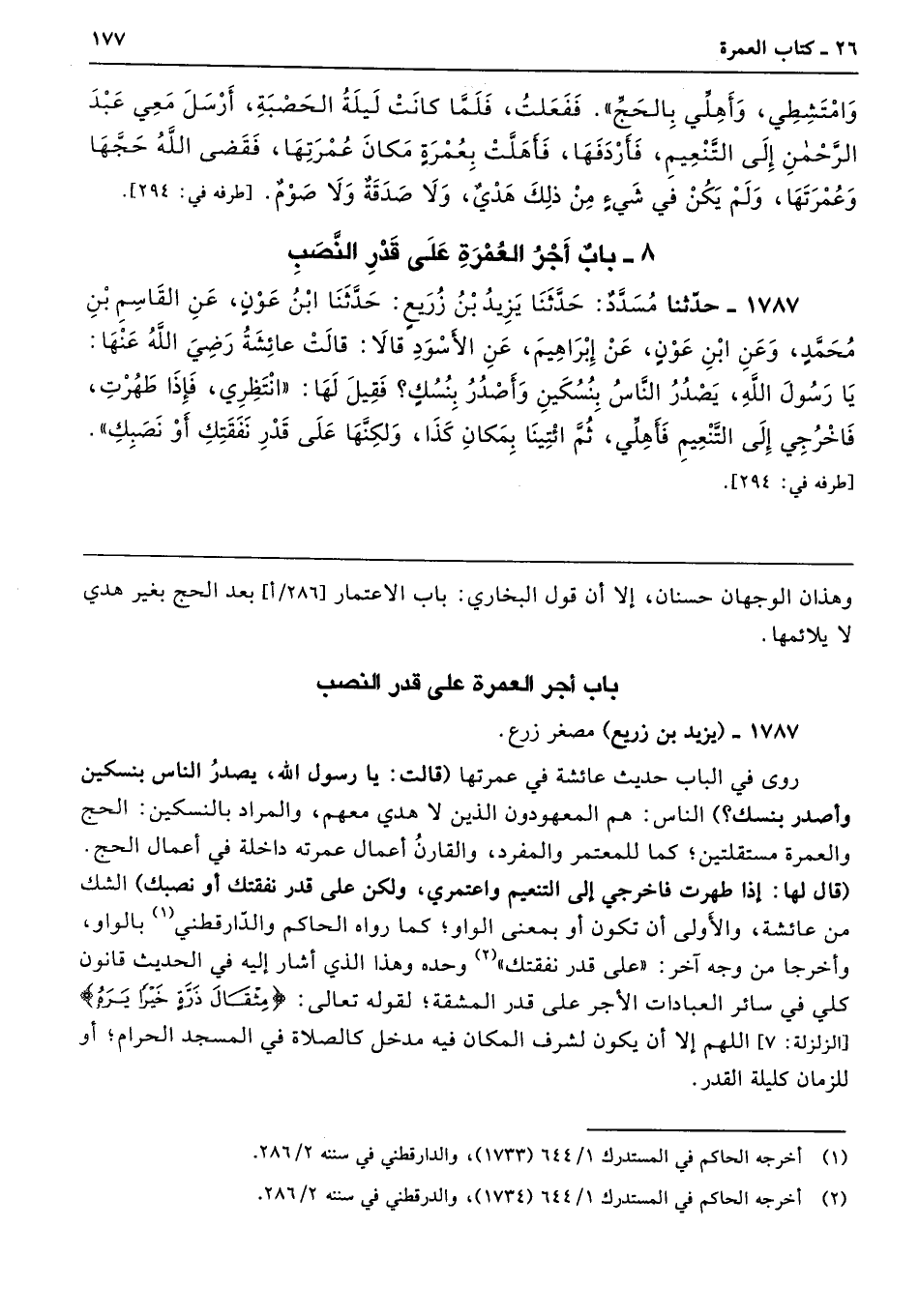 1787 - حَدَّثَنَا مُسَدَّدٌ حَدَّثَنَا يَزِيدُ بْنُ زُرَيْعٍ حَدَّثَنَا ابْنُ عَوْنٍ عَنِ الْقَاسِمِ بْنِ مُحَمَّدٍ وَعَنِ ابْنِ عَوْنٍ عَنْ إِبْرَاهِيمَ عَنِ الأَسْوَدِ قَالاَ قَالَتْ عَائِشَةُ - رضى الله عنها - يَا رَسُولَ اللَّهِ يَصْدُرُ النَّاسُ بِنُسُكَيْنِ وَأَصْدُرُ بِنُسُكٍ فَقِيلَ لَهَا «انْتَظِرِى، فَإِذَا طَهُرْتِ فَاخْرُجِى إِلَى التَّنْعِيمِ، فَأَهِلِّى ثُمَّ ائْتِينَا بِمَكَانِ كَذَا، وَلَكِنَّهَا عَلَى قَدْرِ نَفَقَتِكِ، أَوْ نَصَبِكِ». طرفه 294