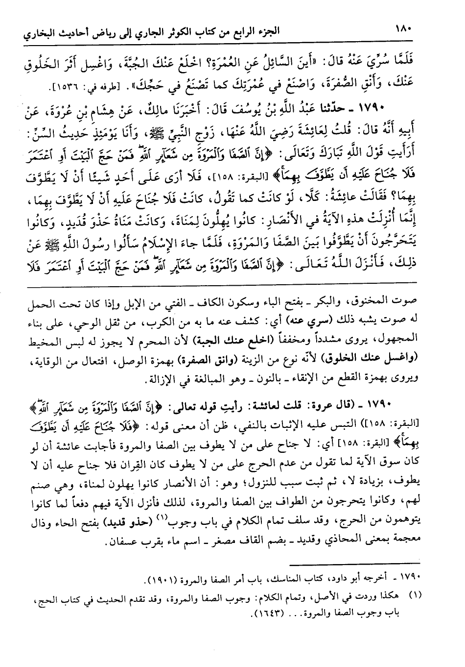 1790 - (قال عروة: قلت لعائشة: رأيتِ قوله تعالى: {إِنَّ الصَّفَا وَالْمَرْوَةَ مِنْ شَعَائِرِ اللَّهِ} [البقرة: 158] التبس عليه الإثبات بالنفي، ظن أن معنى قوله: {فَلَا جُنَاحَ عَلَيْهِ أَنْ يَطَّوَّفَ بِهِمَا} [البقرة: 158] أي: لا جناح على من لا يطوف بين الصفا والمروة فأجابت عائشة أن لو كان سوق الآية لما تقول من عدم الحرج على من لا يطوف كان القِران فلا جناح عليه أن لا يطوف، بزيادة لا، ثم ثبت سبب للنزول؛ وهو: أن الأنصار كانوا يهلون لمناة، وهي صنم لهم، وكانوا يتحرجون من الطواف بين الصفا والمروة، لذلك فأنزل الآية فيهم دفعًا لما كانوا يتوهمون من الحرج، وقد سلف تمام الكلام في باب وجوب (حذو قديد) بفتح الحاء وذال معجمة بمعنى المحاذي وقديد -بضم القاف مصغر- اسم ماء بقرب عسفان.