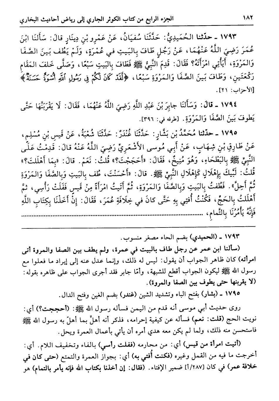1795 - حَدَّثَنَا مُحَمَّدُ بْنُ بَشَّارٍ حَدَّثَنَا غُنْدَرٌ حَدَّثَنَا شُعْبَةُ عَنْ قَيْسِ بْنِ مُسْلِمٍ عَنْ طَارِقِ بْنِ شِهَابٍ عَنْ أَبِى مُوسَى الأَشْعَرِىِّ - رضى الله عنه - قَالَ قَدِمْتُ عَلَى النَّبِيِّ - صلى الله عليه وسلم - بِالْبَطْحَاءِ وَهُوَ مُنِيخٌ فَقَالَ «أَحَجَجْتَ». قُلْتُ نَعَمْ. قَالَ «بِمَا أَهْلَلْتَ». قُلْتُ لَبَّيْكَ بِإِهْلاَلٍ كَإِهْلاَلِ النَّبِيِّ - صلى الله عليه وسلم - قَالَ «أَحْسَنْتَ. طُفْ بِالْبَيْتِ وَبِالصَّفَا وَالْمَرْوَةِ ثُمَّ أَحِلَّ». فَطُفْتُ بِالْبَيْتِ، وَبِالصَّفَا وَالْمَرْوَةِ، ثُمَّ أَتَيْتُ امْرَأَةً مِنْ قَيْسٍ، فَفَلَتْ رَأْسِى، ثُمَّ أَهْلَلْتُ بِالْحَجِّ. فَكُنْتُ أُفْتِى بِهِ، حَتَّى كَانَ فِي خِلاَفَةِ عُمَرَ فَقَالَ إِنْ أَخَذْنَا بِكِتَابِ اللَّهِ فَإِنَّهُ يَأْمُرُنَا بِالتَّمَامِ،