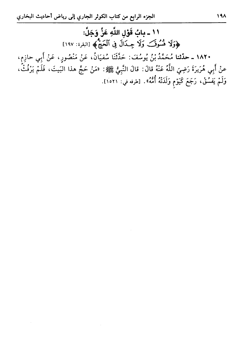 1820 - حَدَّثَنَا مُحَمَّدُ بْنُ يُوسُفَ حَدَّثَنَا سُفْيَانُ عَنْ مَنْصُورٍ عَنْ أَبِى حَازِمٍ عَنْ أَبِى هُرَيْرَةَ - رضى الله عنه - قَالَ قَالَ النَّبِىُّ - صلى الله عليه وسلم - «مَنْ حَجَّ هَذَا الْبَيْتَ، فَلَمْ يَرْفُثْ، وَلَمْ يَفْسُقْ، رَجَعَ كَيَوْمِ وَلَدَتْهُ أُمُّهُ». طرفه 1521