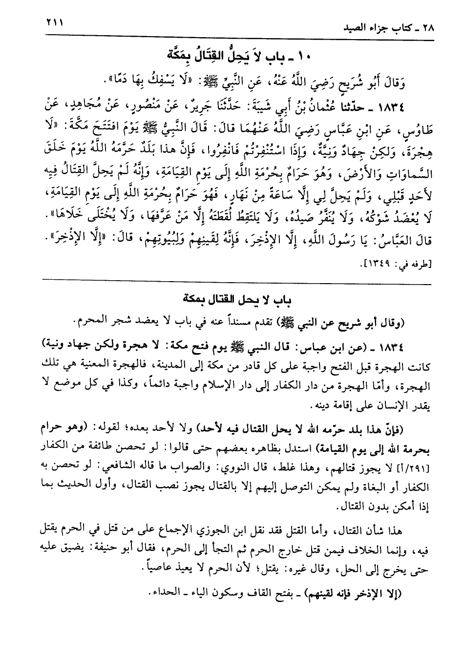 1834 - حَدَّثَنَا عُثْمَانُ بْنُ أَبِى شَيْبَةَ حَدَّثَنَا جَرِيرٌ عَنْ مَنْصُورٍ عَنْ مُجَاهِدٍ عَنْ طَاوُسٍ عَنِ ابْنِ عَبَّاسٍ - رضى الله عنهما - قَالَ قَالَ النَّبِىُّ - صلى الله عليه وسلم - يَوْمَ افْتَتَحَ مَكَّةَ «لاَ هِجْرَةَ وَلَكِنْ جِهَادٌ وَنِيَّةٌ، وَإِذَا اسْتُنْفِرْتُمْ فَانْفِرُوا، فَإِنَّ هَذَا بَلَدٌ حَرَّمَ اللَّهُ يَوْمَ خَلَقَ السَّمَوَاتِ وَالأَرْضَ، وَهُوَ حَرَامٌ بِحُرْمَةِ اللَّهِ إِلَى يَوْمِ الْقِيَامَةِ، وَإِنَّهُ لَمْ يَحِلَّ الْقِتَالُ فِيهِ لأَحَدٍ قَبْلِى، وَلَمْ يَحِلَّ لِى إِلاَّ سَاعَةً مِنْ نَهَارٍ، فَهُوَ حَرَامٌ بِحُرْمَةِ اللَّهِ إِلَى يَوْمِ الْقِيَامَةِ، لاَ يُعْضَدُ شَوْكُهُ، وَلاَ يُنَفَّرُ صَيْدُهُ، وَلاَ يَلْتَقِطُ لُقَطَتَهُ إِلاَّ مَنْ عَرَّفَهَا، وَلاَ يُخْتَلَى خَلاَهَا». قَالَ الْعَبَّاسُ يَا رَسُولَ اللَّهِ. إِلاَّ الإِذْخِرَ، فَإِنَّهُ لِقَيْنِهِمْ وَلِبُيُوتِهِمْ. قَالَ قَالَ «إِلاَّ الإِذْخِرَ». طرفه 1349