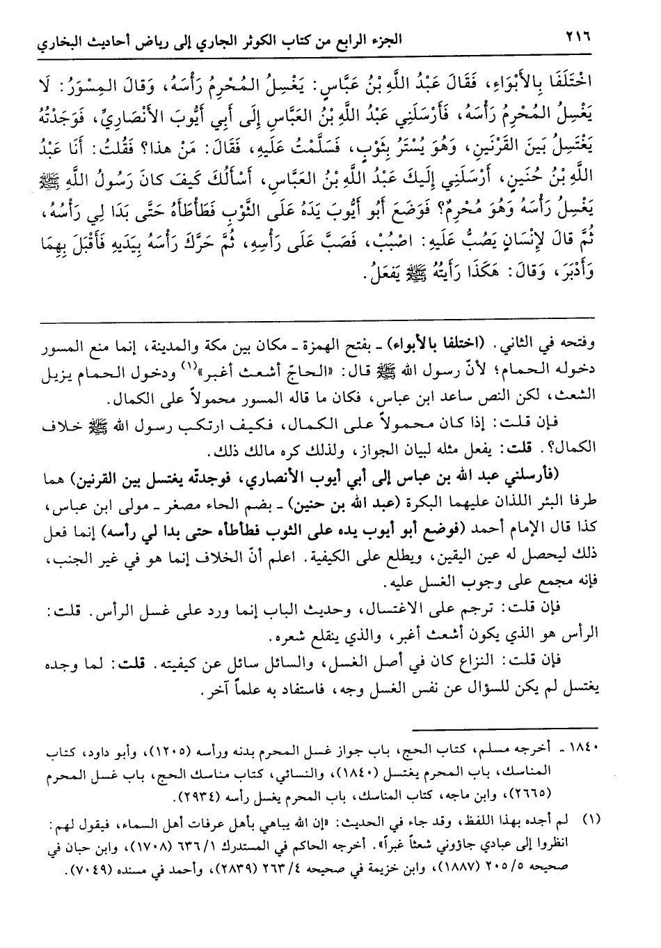وفتحه في الثاني. (اختلفا بالأبواء) -بفتح الهمزة- مكان بين مكة والمدينة، إنما منع المسور دخوله الحمام؛ لأنّ رسول الله - صلى الله عليه وسلم - قال: "الحاجّ أشعث أغبر" ودخول الحمام يزيل الشعث، لكن النص ساعد ابن عباس، فكان ما قاله المسور محمولًا على الكمال.