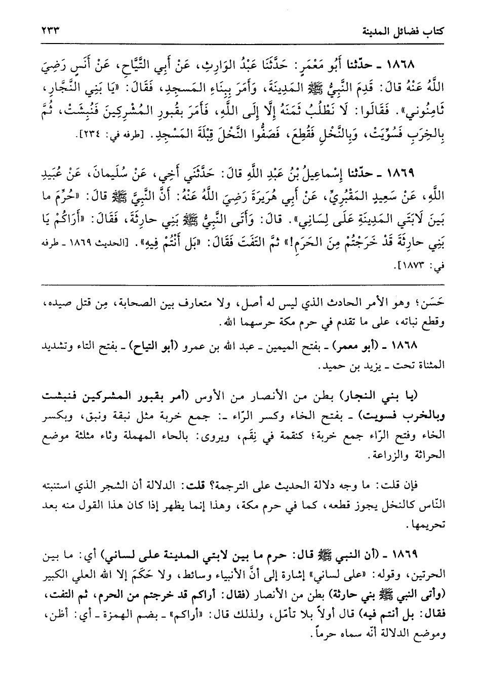 1869 - حَدَّثَنَا إِسْمَاعِيلُ بْنُ عَبْدِ اللَّهِ قَالَ حَدَّثَنِى أَخِى عَنْ سُلَيْمَانَ عَنْ عُبَيْدِ اللَّهِ عَنْ سَعِيدٍ الْمَقْبُرِىِّ عَنْ أَبِى هُرَيْرَةَ - رضى الله عنه - أَنَّ النَّبِىَّ - صلى الله عليه وسلم - قَالَ «حُرِّمَ مَا بَيْنَ لاَبَتَىِ الْمَدِينَةِ عَلَى لِسَانِى». قَالَ وَأَتَى النَّبِىُّ - صلى الله عليه وسلم - بَنِى حَارِثَةَ فَقَالَ «أَرَاكُمْ يَا بَنِى حَارِثَةَ قَدْ خَرَجْتُمْ مِنَ الْحَرَمِ». ثُمَّ الْتَفَتَ، فَقَالَ «بَلْ أَنْتُمْ فِيهِ». طرفه 1873