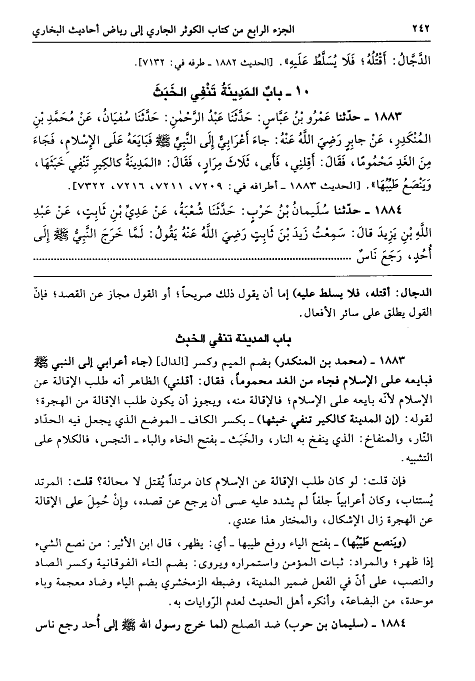 1883 - (محمد بن المنكدر) بضم الميم وكسر [الدال] (جاء أعرابي إلى النبي - صلى الله عليه وسلم - فبايعه على الإسلام فجاء من الغد محمومًا، فقال: أقلني) الظاهر أنه طلب الإقالة عن الإسلام لأنّه بايعه على الإسلام؛ فالإقالة منه، ويجوز أن يكون طلب الإقالة من الهجرة؛ لقوله: (إن المدينة كالكير تنفي خبثها) -بكسر الكاف- الموضع الذي يجعل فيه الحدّاد النّار، والمنفاخ: الذي ينفخ به النار، والخَبَث -بفتح الخاء والباء- النجس، فالكلام على التشبيه.