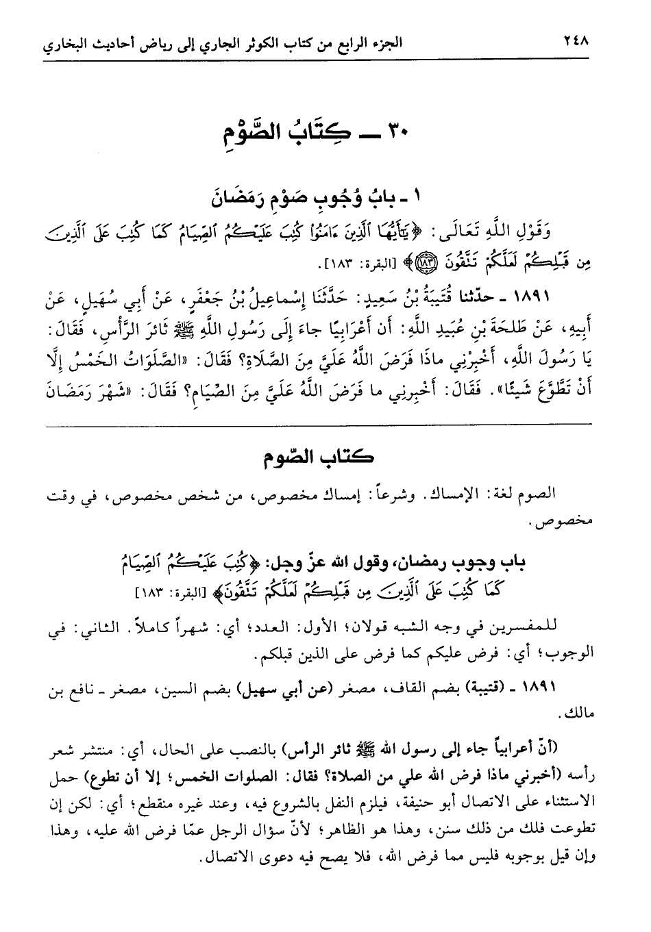 باب وجوب رمضان، وقول الله عزّ وجل: {كُتِبَ عَلَيْكُمُ الصِّيَامُ كَمَا كُتِبَ عَلَى الَّذِينَ مِنْ قَبْلِكُمْ لَعَلَّكُمْ تَتَّقُونَ} [البقرة: 183]