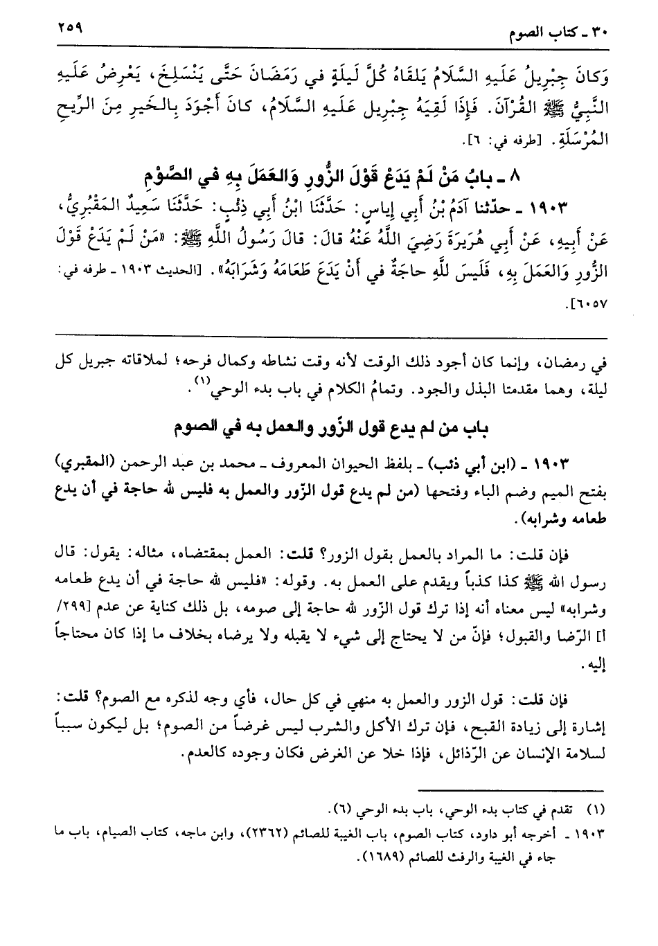1903 - (ابن أبي ذئب) -بلفظ الحيوان المعروف- محمد بن عبد الرحمن (المقبري) بفتح الميم وضم الباء وفتحها (من لم يدع قول الزّور والعمل به فليس لله حاجة في أن يدع طعامه وشرابه).