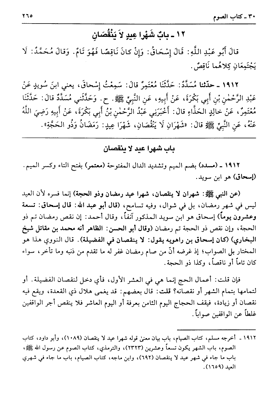 1912 - حَدَّثَنَا مُسَدَّدٌ حَدَّثَنَا مُعْتَمِرٌ قَالَ سَمِعْتُ إِسْحَاقَ عَنْ عَبْدِ الرَّحْمَنِ بْنِ أَبِى بَكْرَةَ عَنْ أَبِيهِ عَنِ النَّبِيِّ - صلى الله عليه وسلم -. وَحَدَّثَنِى مُسَدَّدٌ حَدَّثَنَا مُعْتَمِرٌ عَنْ خَالِدٍ الْحَذَّاءِ قَالَ أَخْبَرَنِى عَبْدُ الرَّحْمَنِ بْنُ أَبِى بَكْرَةَ عَنْ أَبِيهِ - رضى الله عنه - عَنِ النَّبِيِّ - صلى الله عليه وسلم - قَالَ «شَهْرَانِ لاَ يَنْقُصَانِ شَهْرَا عِيدٍ رَمَضَانُ وَذُو الْحَجَّةِ».