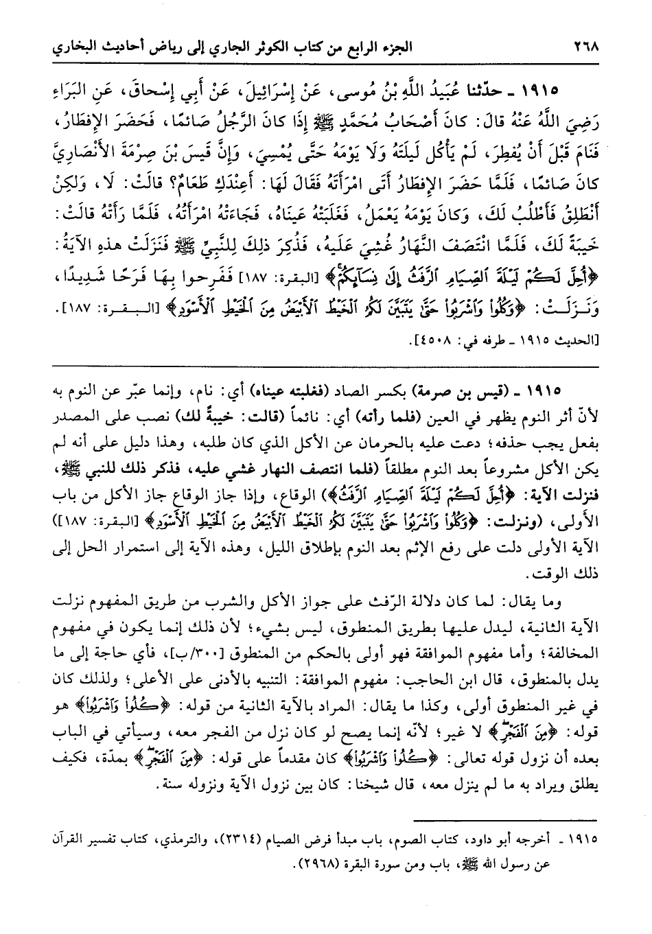 1915 - (قيس بن صرمة) بكسر الصاد (فغلبته عيناه) أي: نام، وإنما عبّر عن النوم به لأنّ أثر النوم يظهر في العين (فلما رأته) أي: نائمًا (قالت: خيبةً لك) نصب على المصدر بفعل يجب حذفه؛ دعت عليه بالحرمان عن الأكل الذي كان طلبه، وهذا دليل على أنه لم يكن الأكل مشروعًا بعد النوم مطلقًا (فلما انتصف النهار غشي عليه، فذكر ذلك للنبي - صلى الله عليه وسلم -، فنزلت الآية: {أُحِلَّ لَكُمْ لَيْلَةَ الصِّيَامِ الرَّفَثُ}) الوقاع، وإذا جاز الوقاع جاز الأكل من باب الأَولى، (ونزلت: {وَكُلُوا وَاشْرَبُوا حَتَّى يَتَبَيَّنَ لَكُمُ الْخَيْطُ الْأَبْيَضُ مِنَ الْخَيْطِ الْأَسْوَدِ} [البقرة: 187]) الآية الأولى دلت على رفع الإثم بعد النوم بإطلاق الليل، وهذه الآية إلى استمرار الحل إلى ذلك الوقت.