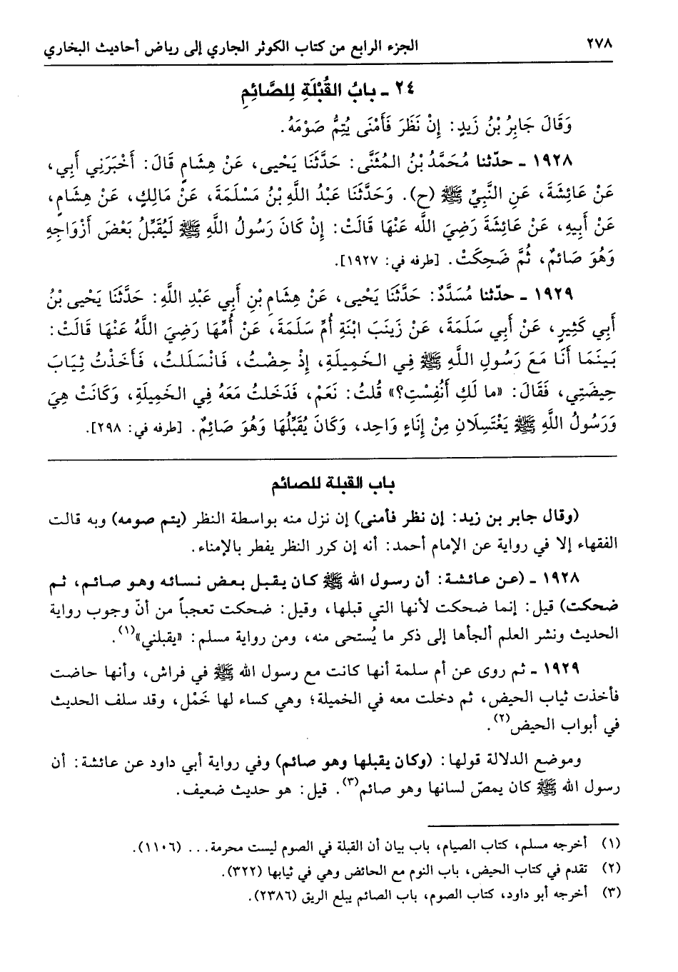 وموضع الدلالة قولها: (وكان يقبلها وهو صائم) وفي رواية أبي داود عن عائشة: أن رسول الله - صلى الله عليه وسلم - كان يمصّ لسانها وهو صائم. قيل: هو حديث ضعيف.