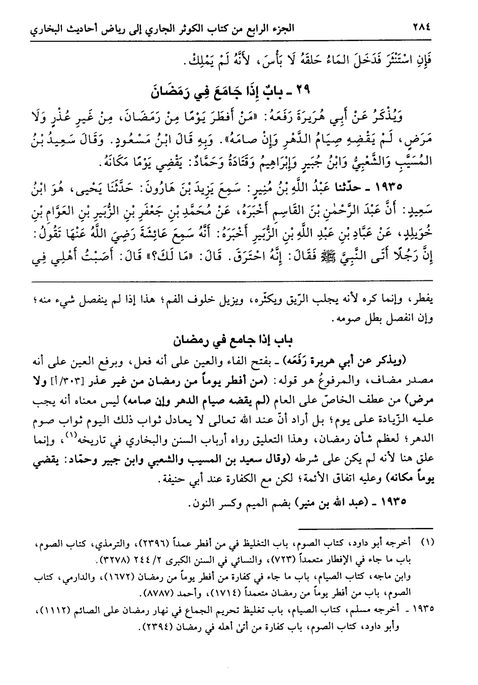 (ويذكر عن أبي هريرة رَفَعَه) -بفتح الفاء والعين على أنَّه فعل، وبرفع العين على أنَّه مصدر مضاف، والمرفوعُ هو قوله: (من أفطر يومًا من رمضان من غير عذر ولا مرض) من عطف الخاصِّ على العام (لم يقضه صيام الدهر وإن صامه) ليس معناه أنَّه يجب عليه الزيادة على يوم؛ بل أراد أنّ عند الله تعالى لا يعادل ثواب ذلك اليوم ثواب صوم الدهر؛ لعظم شأن رمضان، وهذا التعليق رواه أرباب السنن والبخاري في تاريخه، وإنَّما علق هنا لأنه لم يكن على شرطه (وقال سعيد بن المسيب والشعبي وابن جبير وحمّاد: يقضي يومًا مكانه) وعليه اتفاق الأئمة؛ لكن مع الكفارة عند أبي حنيفة.