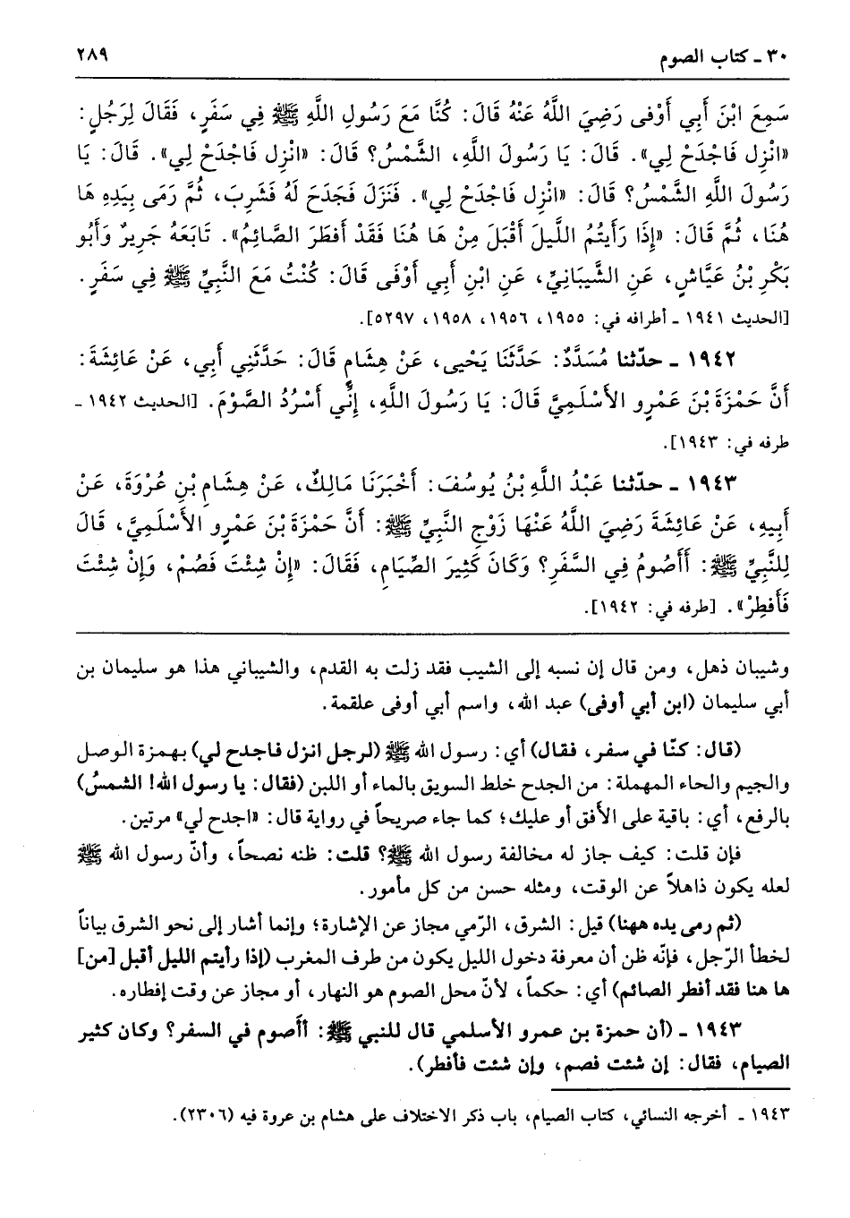 1943 - حَدَّثَنَا عَبْدُ اللَّهِ بْنُ يُوسُفَ أَخْبَرَنَا مَالِكٌ عَنْ هِشَامِ بْنِ عُرْوَةَ عَنْ أَبِيهِ عَنْ عَائِشَةَ - رضى الله عنها - زَوْجِ النَّبِيِّ - صلى الله عليه وسلم - أَنَّ حَمْزَةَ بْنَ عَمْرٍو الأَسْلَمِىَّ قَالَ لِلنَّبِىِّ - صلى الله عليه وسلم - أَأَصُومُ فِي السَّفَرِ وَكَانَ كَثِيرَ الصِّيَامِ. فَقَالَ «إِنْ شِئْتَ فَصُمْ، وَإِنْ شِئْتَ فَأَفْطِرْ». طرفه 1942