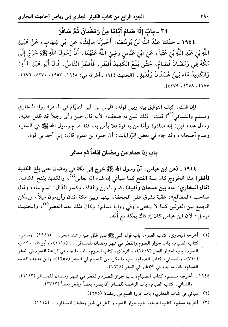 1944 - حَدَّثَنَا عَبْدُ اللَّهِ بْنُ يُوسُفَ أَخْبَرَنَا مَالِكٌ عَنِ ابْنِ شِهَابٍ عَنْ عُبَيْدِ اللَّهِ بْنِ عَبْدِ اللَّهِ بْنِ عُتْبَةَ عَنِ ابْنِ عَبَّاسٍ - رضى الله عنهما - أَنَّ رَسُولَ اللَّهِ - صلى الله عليه وسلم - خَرَجَ إِلَى مَكَّةَ فِي رَمَضَانَ فَصَامَ حَتَّى بَلَغَ الْكَدِيدَ أَفْطَرَ، فَأَفْطَرَ النَّاسُ. قَالَ أَبُو عَبْدِ اللَّهِ وَالْكَدِيدُ مَاءٌ بَيْنَ عُسْفَانَ وَقُدَيْدٍ. أطرافه 1948، 2953، 4275، 4276، 4277، 4278، 4279
