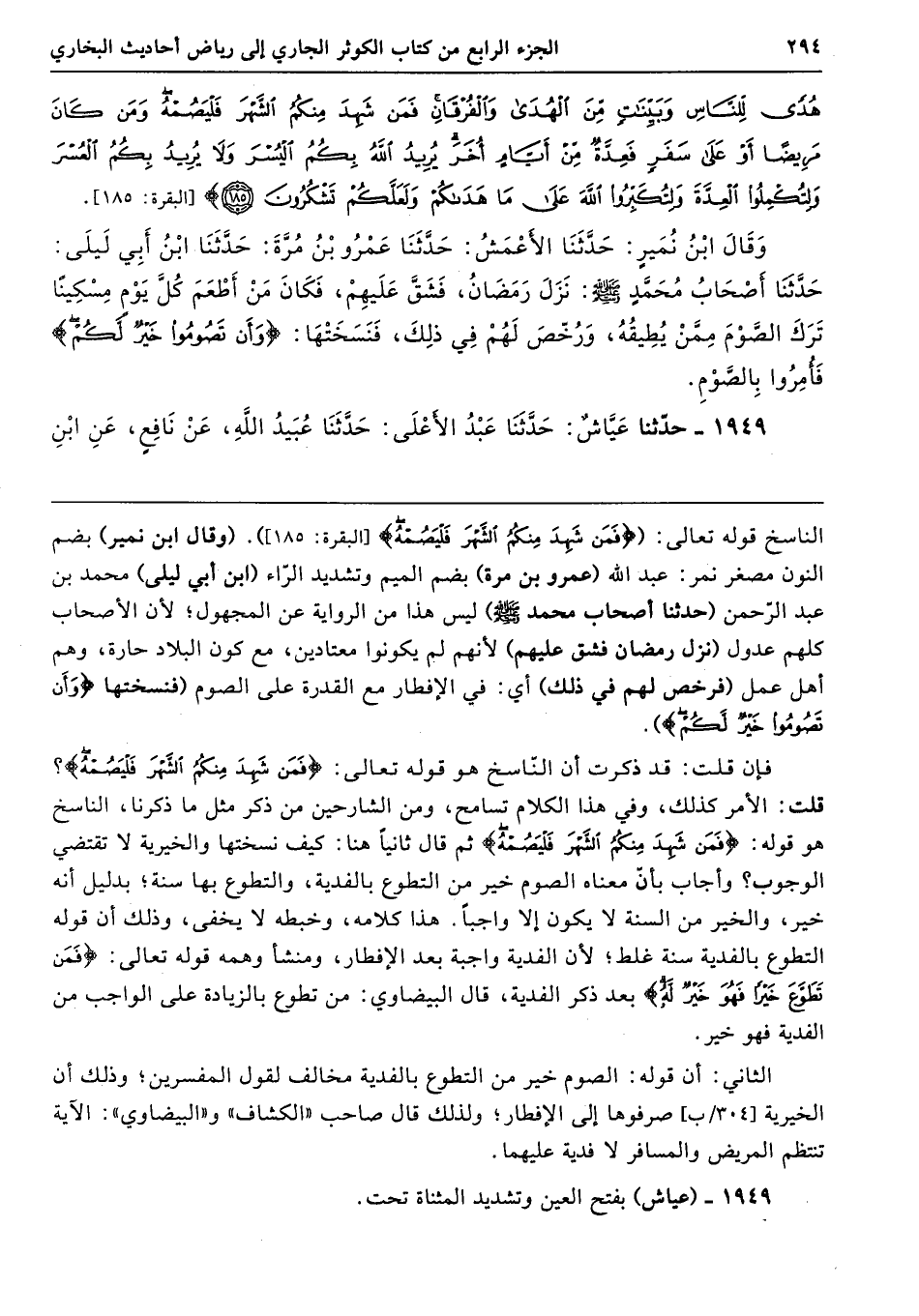 الناسخ قوله تعالى: ({فَمَنْ شَهِدَ مِنْكُمُ الشَّهْرَ فَلْيَصُمْهُ} [البقرة: 185]). (وقال ابن نمير) بضم النون مصغر نمر: عبد الله (عمرو بن مرَّة) بضم الميم وتشديد الرّاء (ابن أبي ليلى) محمد بن عبد الرَّحمن (حدّثنا أصحاب محمد - صلى الله عليه وسلم -) ليس هذا من الرّواية عن المجهول؛ لأنَّ الأصحاب كلهم عدول (نزل رمضان فشق عليهم) لأنهم لم يكونوا معتادين، مع كون البلاد حارة، وهم أهل عمل (فرخص لهم في ذلك) أي: في الإفطار مع القدرة على الصوم (فنسختها {وَأَنْ تَصُومُوا خَيْرٌ لَكُمْ}).