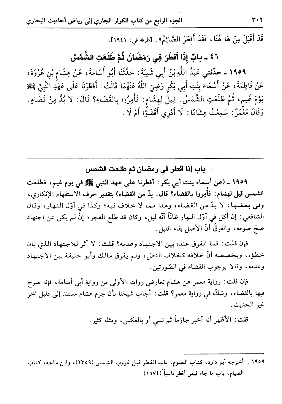 1959 - (عن أسماء بنت أبي بكر: أفطرنا على عهد النَّبيِّ - صَلَّى الله عليه وسلم - في يوم غيم، فطلعت الشَّمس قيل لهشام: فأُمِروا بالقضاء؟ قال: بدّ من القضاء) بتقدير حرف الاستفهام الإنكاري، وفي بعضها: لا بدّ من القضاء، وهذا ممَّا لا خلاف فيه؛ وكذا في أوّل النهار، وقال الشَّافعي: إن أكل في أوّل النهار ظانًا أنّه ليل، وكان قد طلع الفجر؛ إنْ لم يكن عن اجتهاد صحّ صومه، والفرقُ أنّ الأصل بقاء الليل.