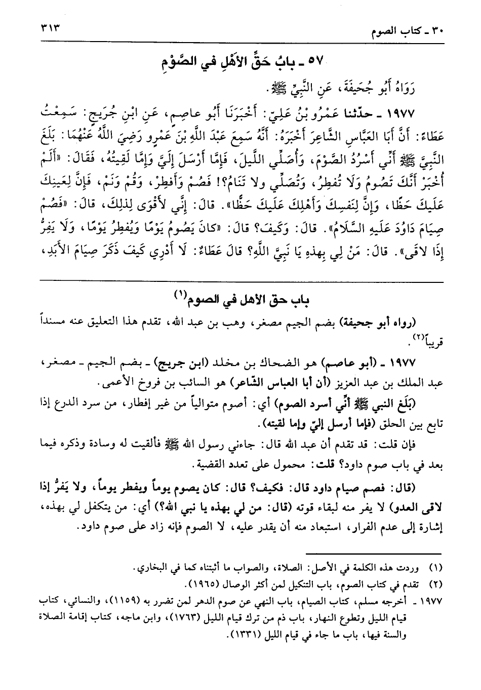1977 - حَدَّثَنَا عَمْرُو بْنُ عَلِىٍّ أَخْبَرَنَا أَبُو عَاصِمٍ عَنِ ابْنِ جُرَيْجٍ سَمِعْتُ عَطَاءً أَنَّ أَبَا الْعَبَّاسِ الشَّاعِرَ أَخْبَرَهُ أَنَّهُ سَمِعَ عَبْدَ اللَّهِ بْنَ عَمْرٍو - رضى الله عنهما - بَلَغَ النَّبِىَّ - صلى الله عليه وسلم - أَنِّى أَسْرُدُ الصَّوْمَ وَأُصَلِّى اللَّيْلَ، فَإِمَّا أَرْسَلَ إِلَىَّ، وَإِمَّا لَقِيتُهُ، فَقَالَ «أَلَمْ أُخْبَرْ أَنَّكَ تَصُومُ وَلاَ تُفْطِرُ، وَتُصَلِّى وَلاَ تَنَامُ، فَصُمْ وَأَفْطِرْ، وَقُمْ وَنَمْ، فَإِنَّ لِعَيْنِكَ عَلَيْكَ حَظًّا، وَإِنَّ لِنَفْسِكَ وَأَهْلِكَ عَلَيْكَ حَظًّا». قَالَ إِنِّى لأَقْوَى لِذَلِكَ. قَالَ «فَصُمْ صِيَامَ دَاوُدَ - عَلَيْهِ السَّلاَمُ -». قَالَ وَكَيْفَ قَالَ «كَانَ يَصُومُ يَوْمًا وَيُفْطِرُ يَوْمًا، وَلاَ يَفِرُّ إِذَا لاَقَى». قَالَ مَنْ لِى بِهَذِهِ يَا نَبِىَّ اللَّهِ قَالَ عَطَاءٌ لاَ أَدْرِى كَيْفَ ذَكَرَ صِيَامَ الأَبَدِ،