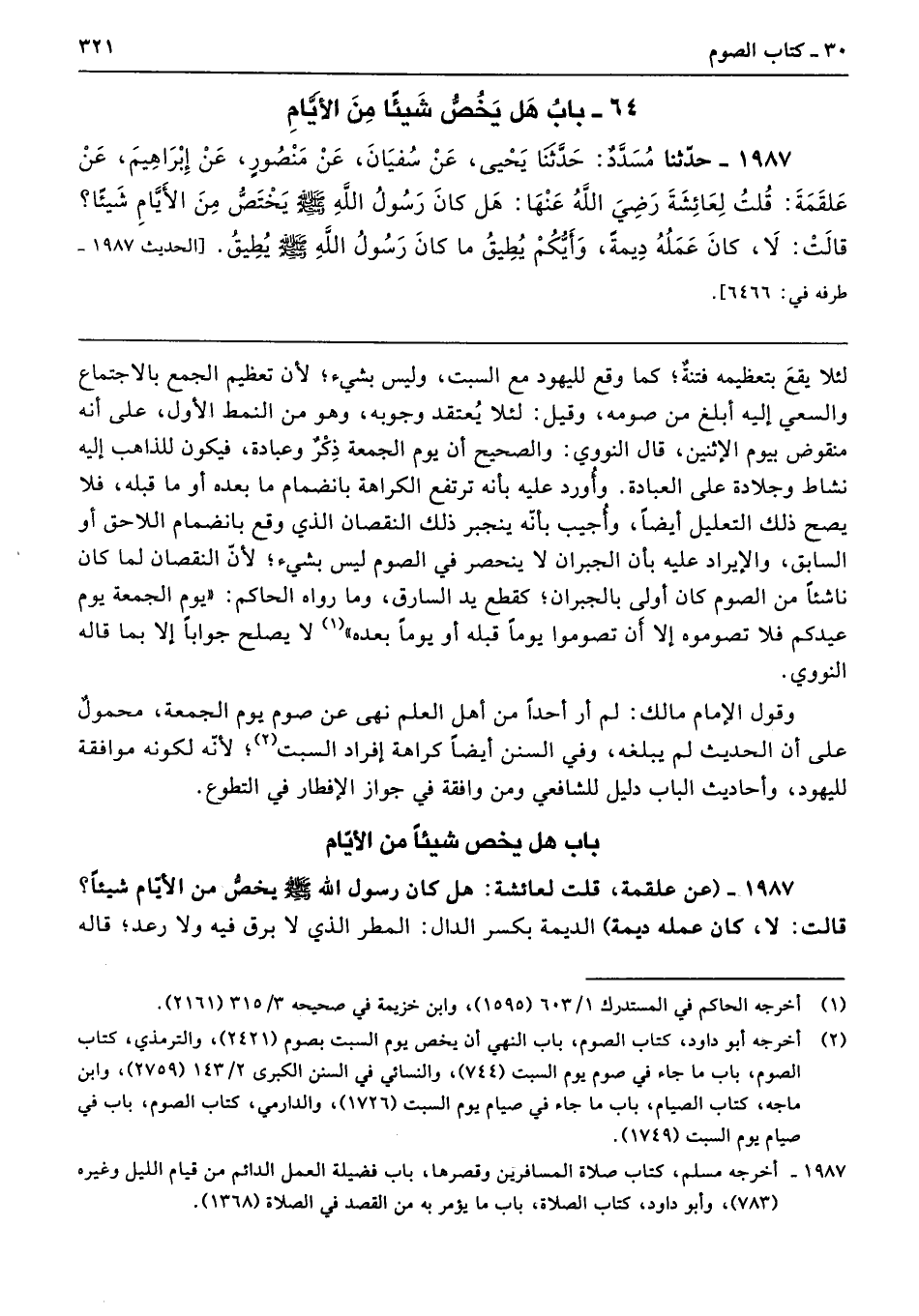 1987 - حَدَّثَنَا مُسَدَّدٌ حَدَّثَنَا يَحْيَى عَنْ سُفْيَانَ عَنْ مَنْصُورٍ عَنْ إِبْرَاهِيمَ عَنْ عَلْقَمَةَ قُلْتُ لِعَائِشَةَ - رضى الله عنها - هَلْ كَانَ رَسُولُ اللَّهِ - صلى الله عليه وسلم - يَخْتَصُّ مِنَ الأَيَّامِ شَيْئًا قَالَتْ لاَ، كَانَ عَمَلُهُ دِيمَةً، وَأَيُّكُمْ يُطِيقُ مَا كَانَ رَسُولُ اللَّهِ - صلى الله عليه وسلم - يُطِيقُ طرفه 6466.