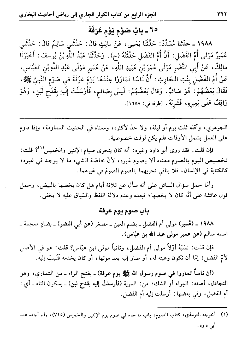 1988 - حَدَّثَنَا مُسَدَّدٌ حَدَّثَنَا يَحْيَى عَنْ مَالِكٍ قَالَ حَدَّثَنِى سَالِمٌ قَالَ حَدَّثَنِى عُمَيْرٌ مَوْلَى أُمِّ الْفَضْلِ أَنَّ أُمَّ الْفَضْلِ حَدَّثَتْهُ ح وَحَدَّثَنَا عَبْدُ اللَّهِ بْنُ يُوسُفَ أَخْبَرَنَا مَالِكٌ عَنْ أَبِى النَّضْرِ مَوْلَى عُمَرَ بْنِ عُبَيْدِ اللَّهِ عَنْ عُمَيْرٍ مَوْلَى عَبْدِ اللَّهِ بْنِ الْعَبَّاسِ عَنْ أُمِّ الْفَضْلِ بِنْتِ الْحَارِثِ أَنَّ نَاسًا تَمَارَوْا عِنْدَهَا يَوْمَ عَرَفَةَ فِي صَوْمِ النَّبِيِّ - صلى الله عليه وسلم - فَقَالَ بَعْضُهُمْ هُوَ صَائِمٌ. وَقَالَ بَعْضُهُمْ لَيْسَ بِصَائِمٍ. فَأَرْسَلَتْ إِلَيْهِ بِقَدَحِ لَبَنٍ وَهْوَ وَاقِفٌ عَلَى بَعِيرِهِ فَشَرِبَهُ. طرفه 1658
